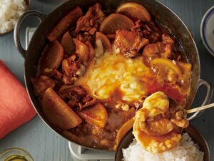 (2)ふたをしてごく弱火で7~8分、豆腐が温まるまで煮る。器に[B]を入れ、煮汁適量を加えてのばし、豆腐とたらをつけながら食べる。