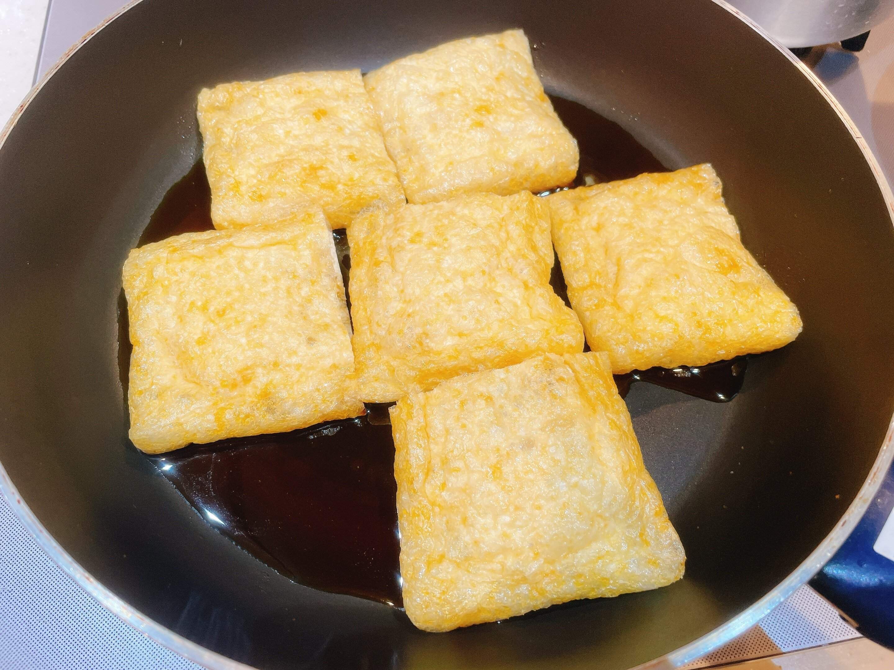 フライパンに、しょうゆ、みりん、砂糖を1:1:1でいれて、おもちをいれた油揚げを並べて煮ます。