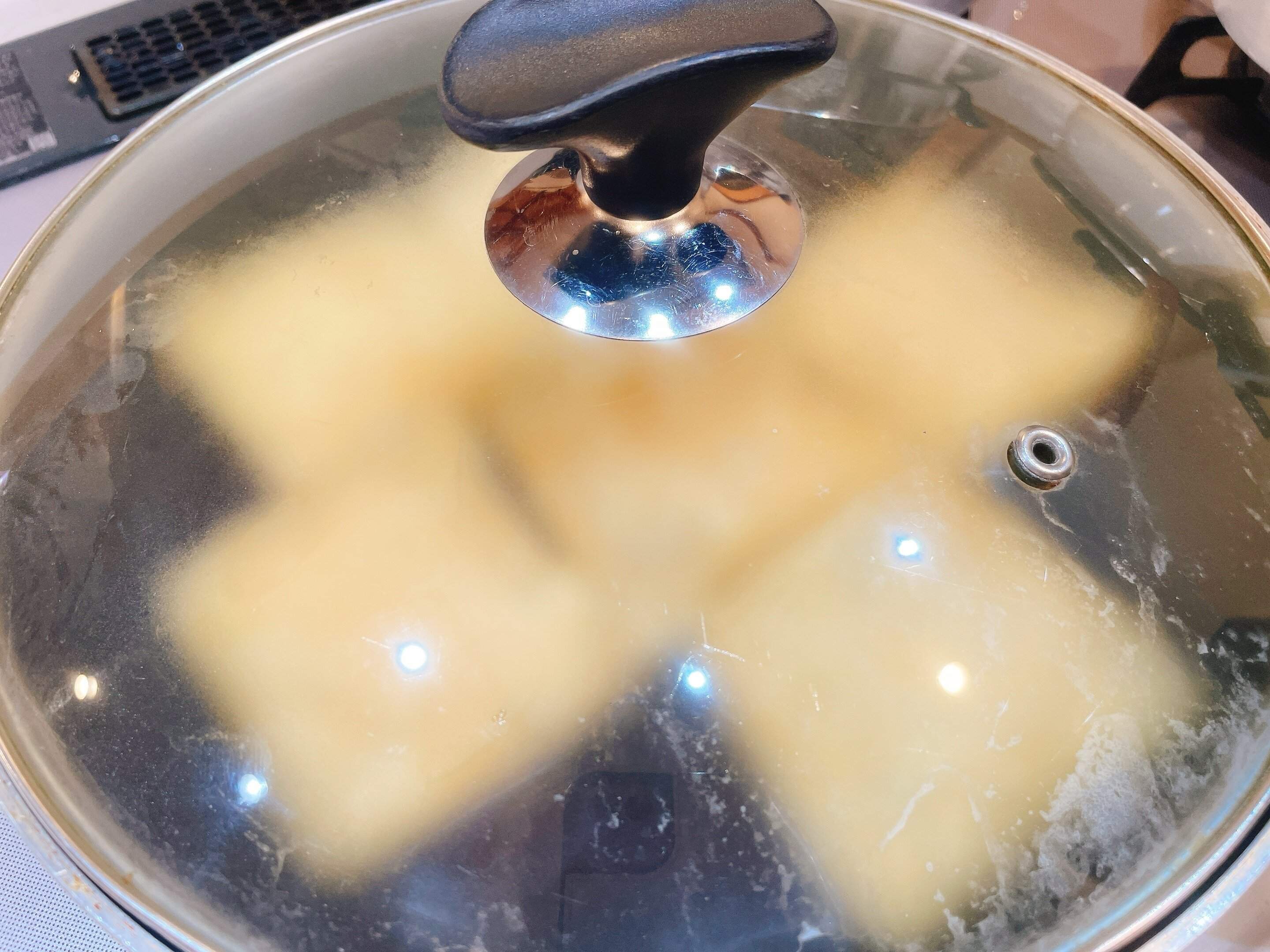 フタをして、弱火〜中火でおもちが柔らかくなるまで煮ます。