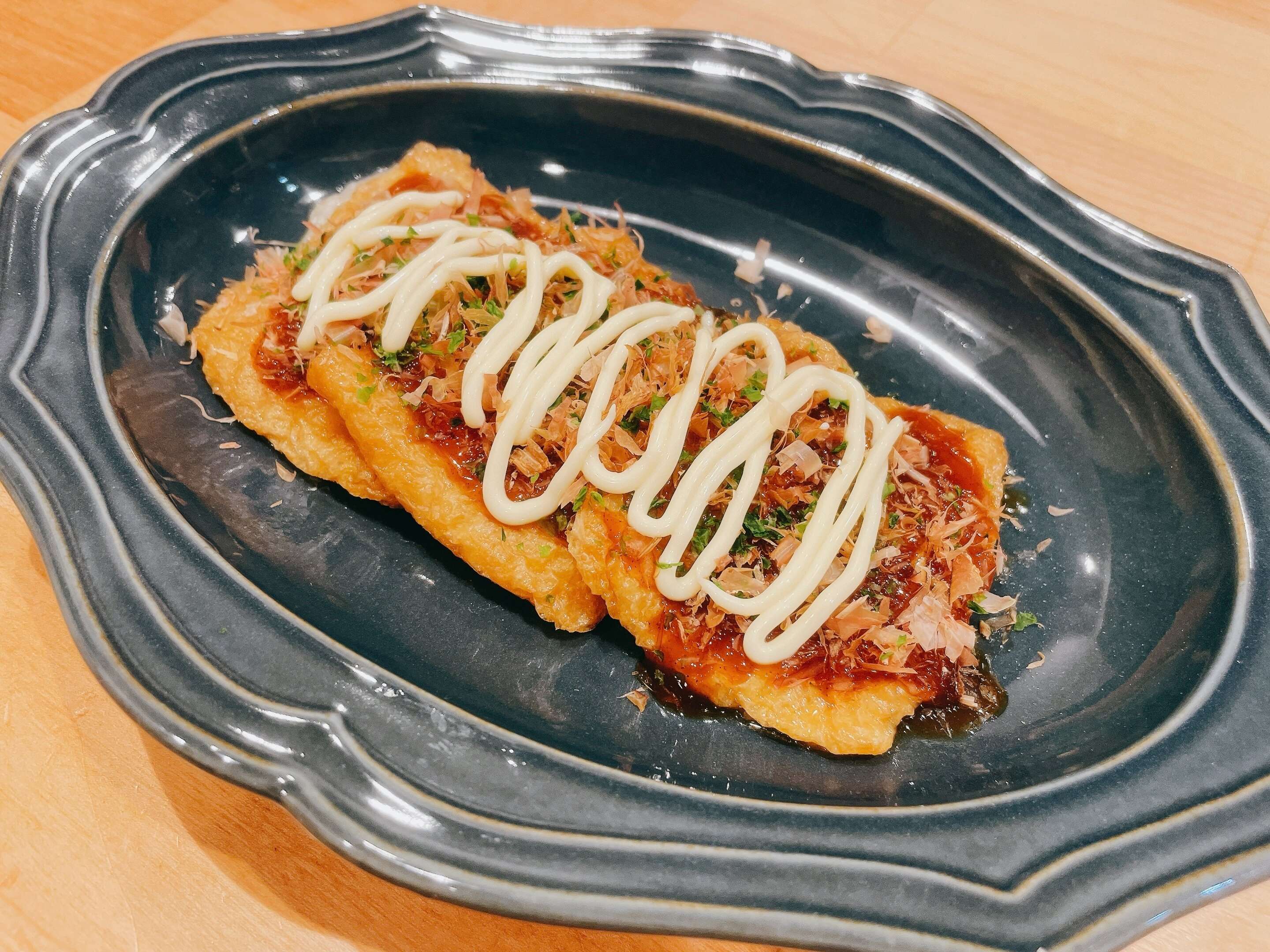 ソース、マヨネーズ、鰹節、青のりをトッピングすると、「お好み焼き風いなりもち」の完成です。