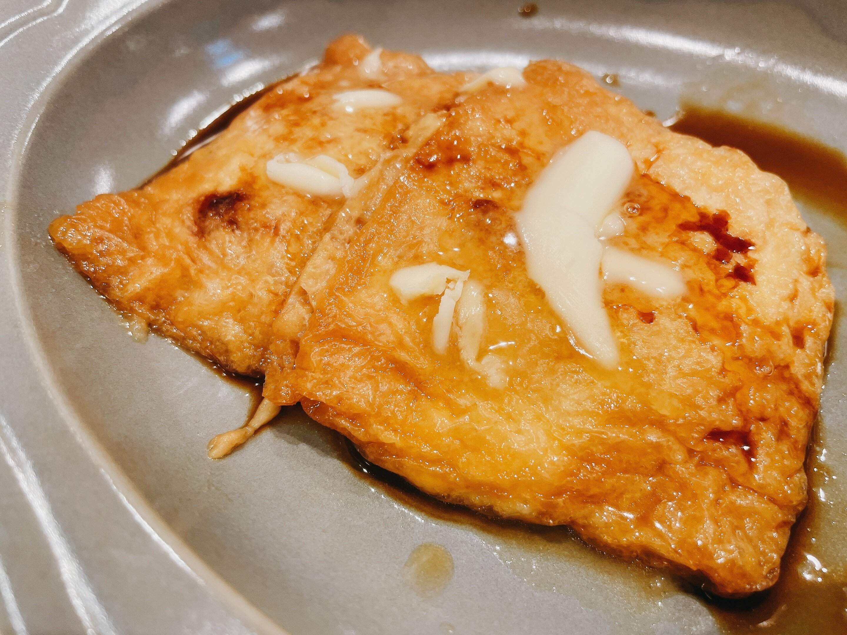 トロトロになったおもちと油揚げがしっかり絡みついて、とても食べやすくなり、油揚げの甘みとおもちがよく合います。