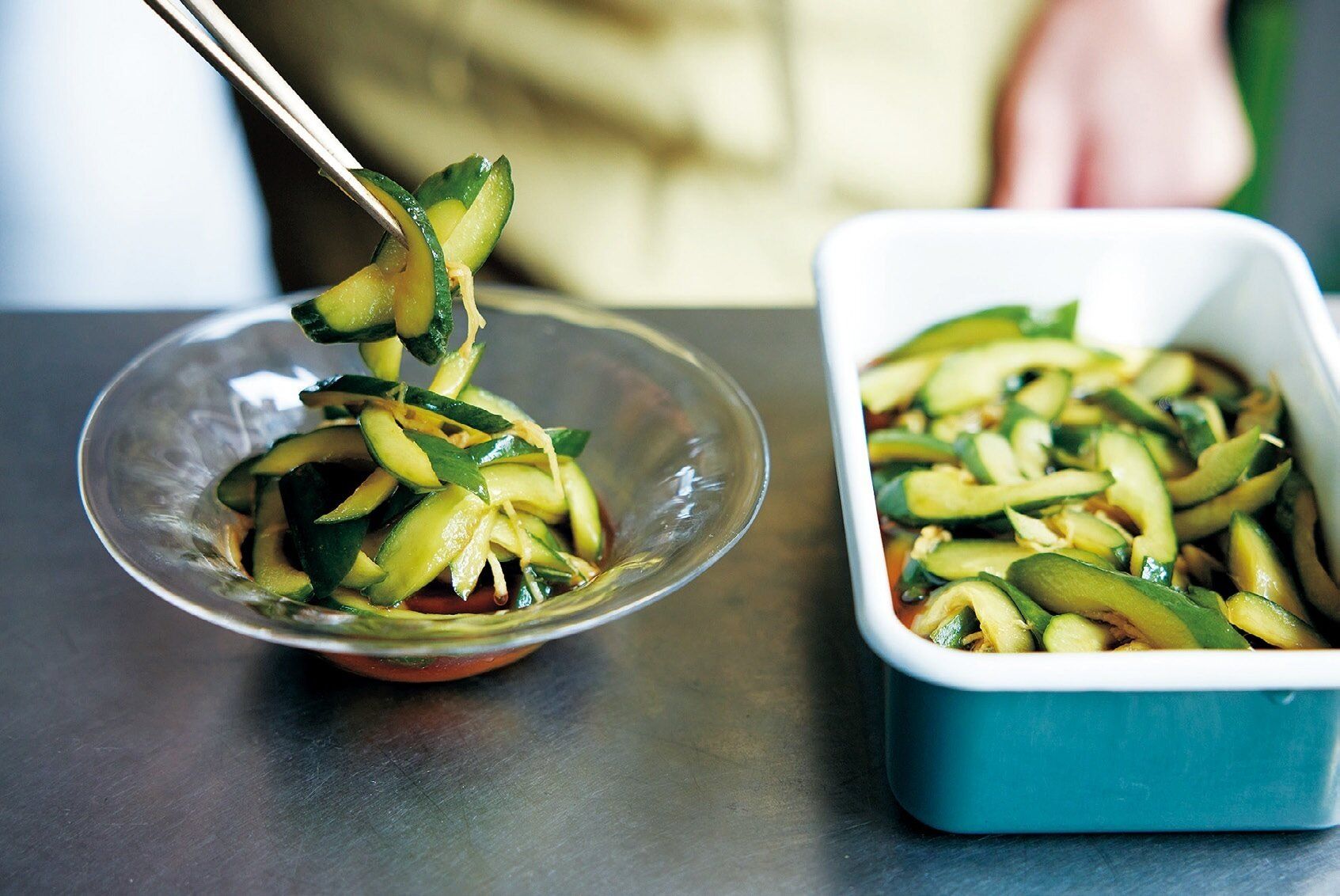 (1)きゅうりは縦半分に切る。種を除き(すぐ食べるときは除かなくてもいい)、斜め薄切りにする。