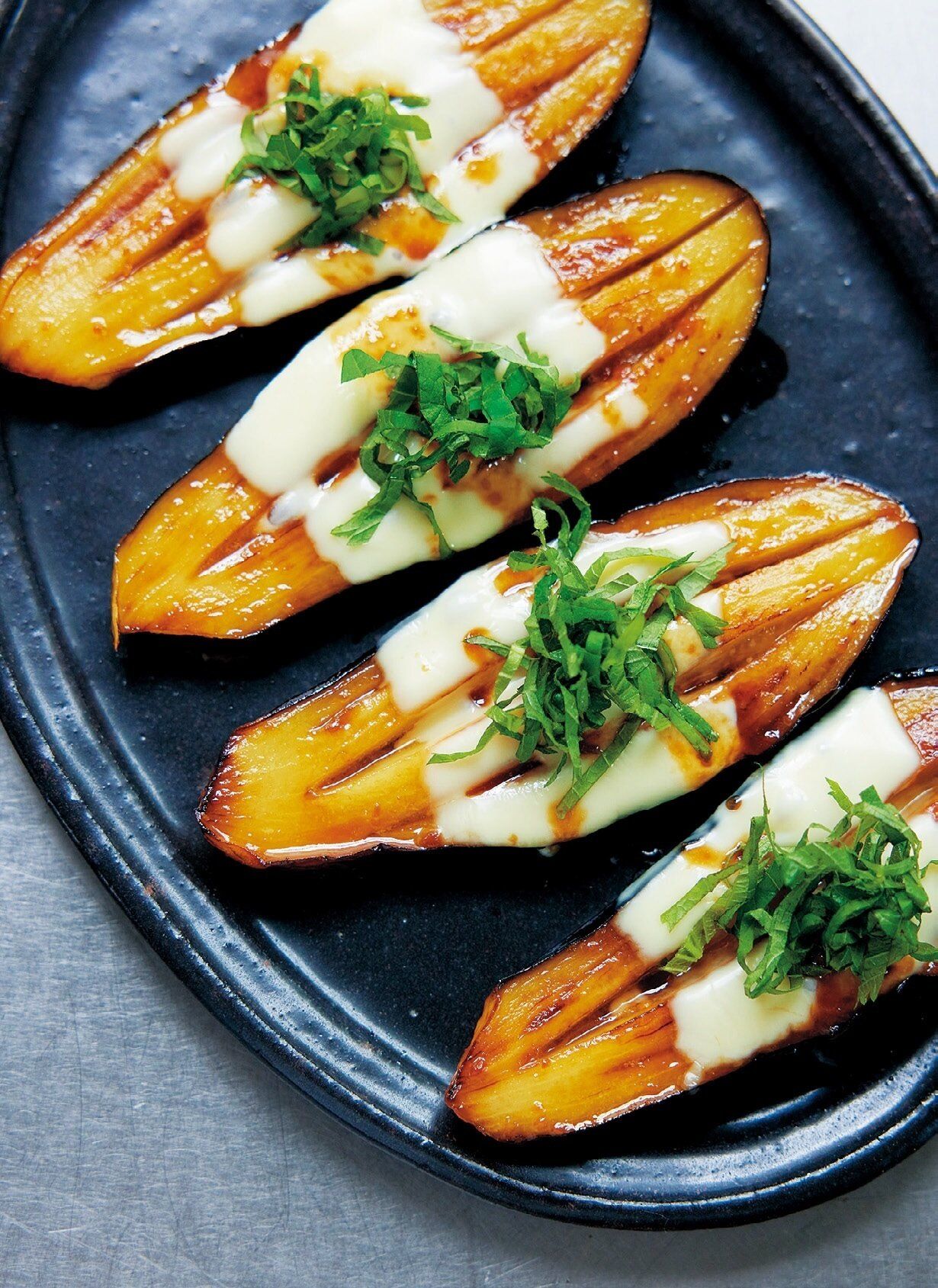 (2)フライパンにサラダ油を入れてなす全体に油をからめ、皮目を下にして中火で焼く。色よくなってつやが出たら返して切り口を下にして、ふたをする。弱火で2~3分、蒸し焼きにしてこんがり焼き色をつける。