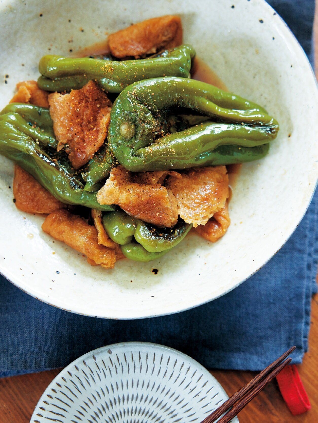 (1)フライパンにサラダ油をひき、ピーマンは手でつぶして、油揚げは手でちぎって入れる。
