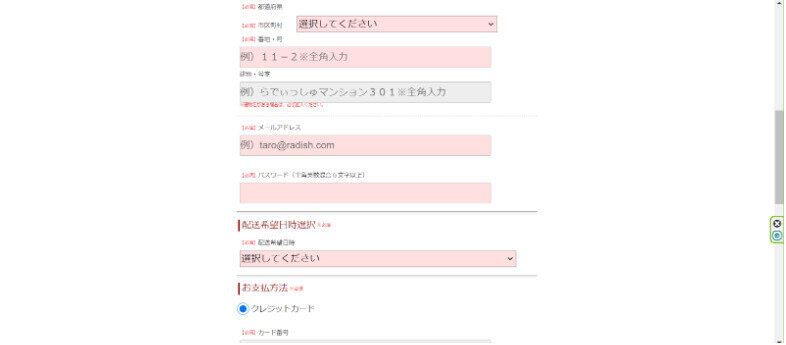 「住所」「メールアドレス」「パスワード」「配送希望日」を入力します。