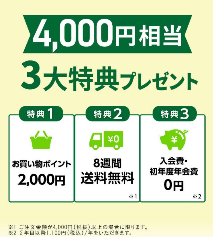 なお、定期便は、年会費が1,100円(税込)がかかります。4000円分のお得があるので、2年目以降の年会費を払ってもお得です。