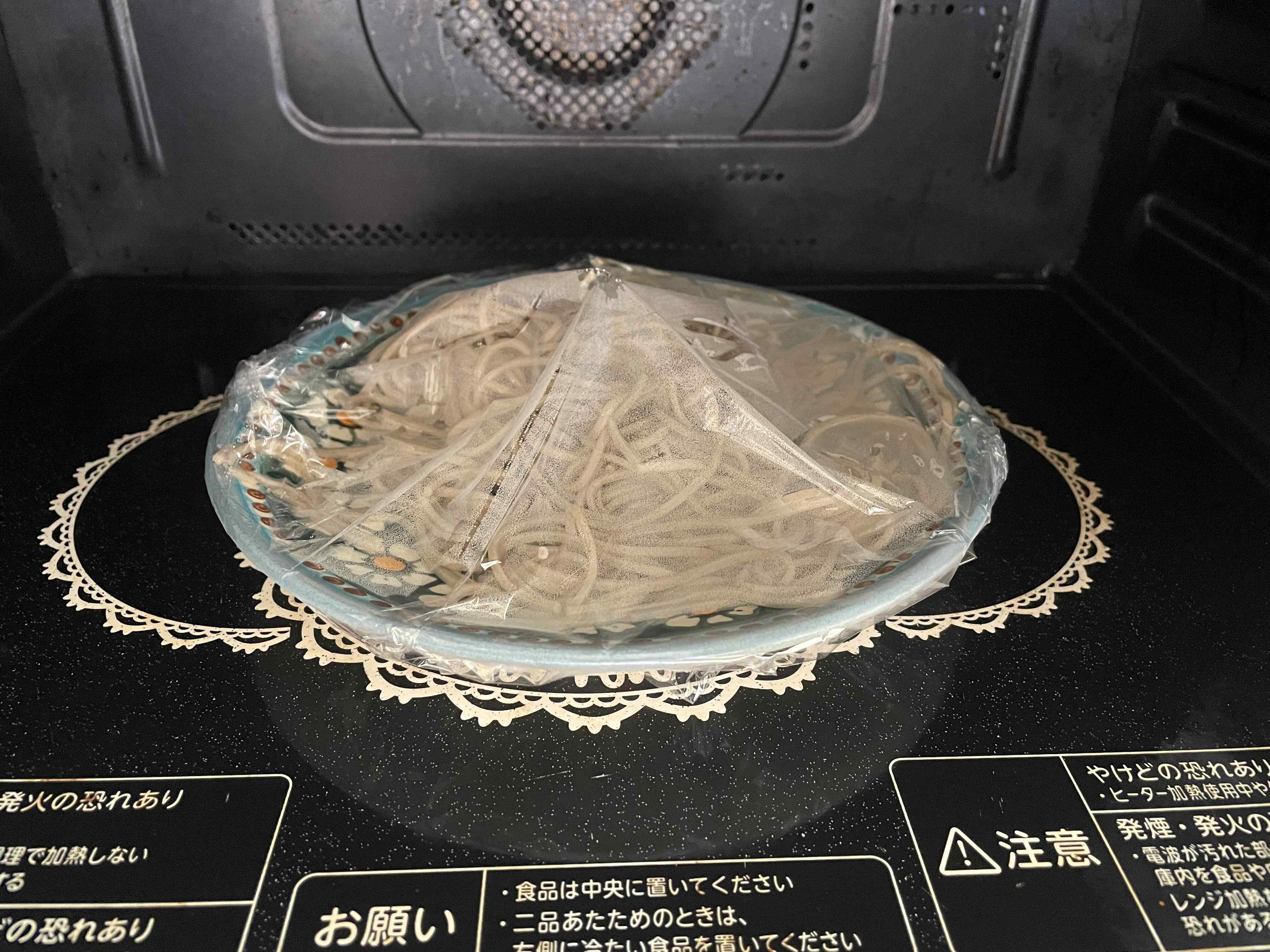 食べ物を温めるときは、そのまま電子レンジに入れずに、ラップをかけてから温めるようにしましょう。そうすれば、食材の飛び散りを抑えられますよね。
