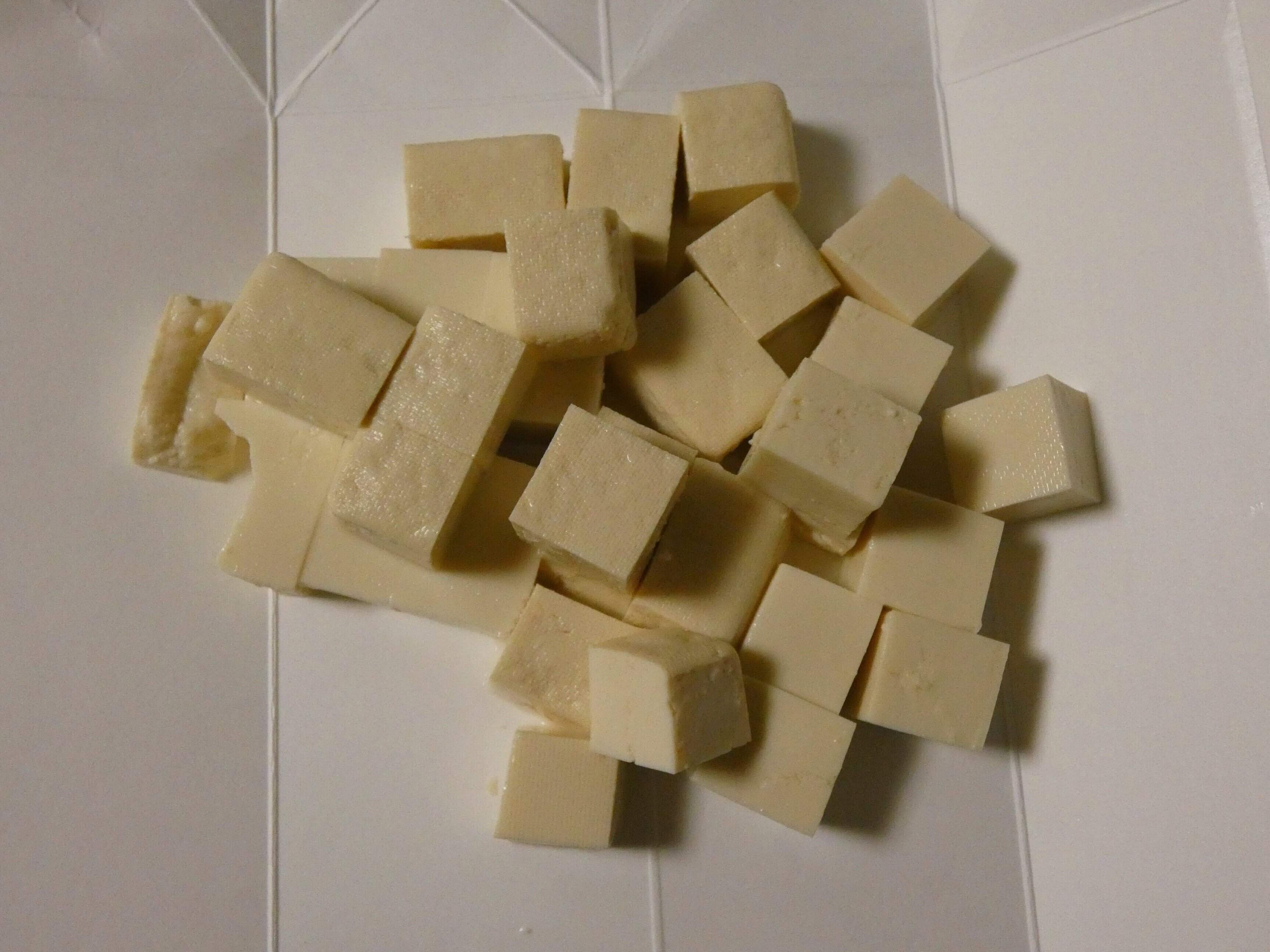 1.豆腐はキッチンペーパーで水気を切り、2cm角にします。にんにくは薄切りにします。