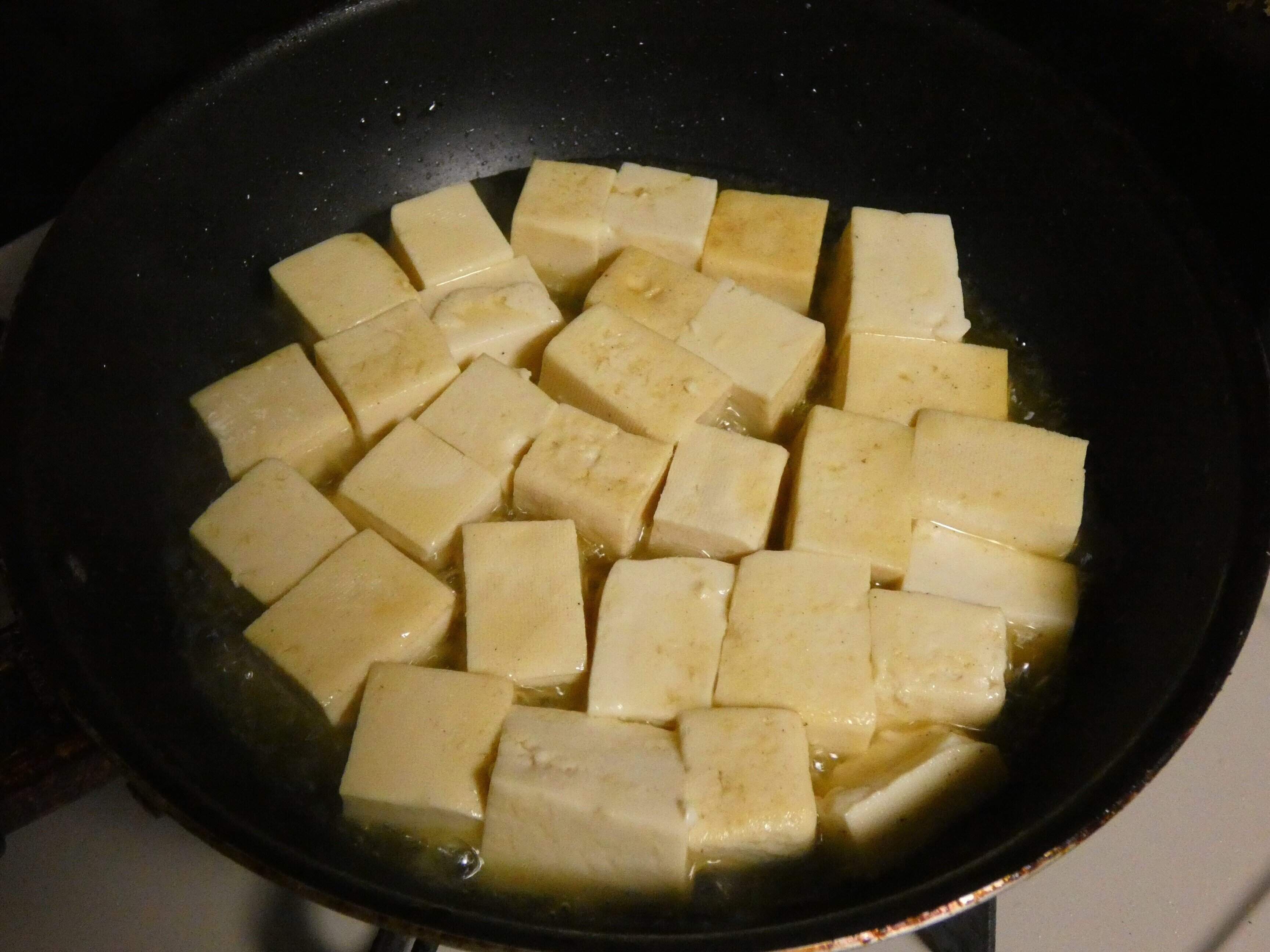 豆腐は途中で上下をひっくり返すと、オリーブオイルが少なめでもしっかり味がつきます。
