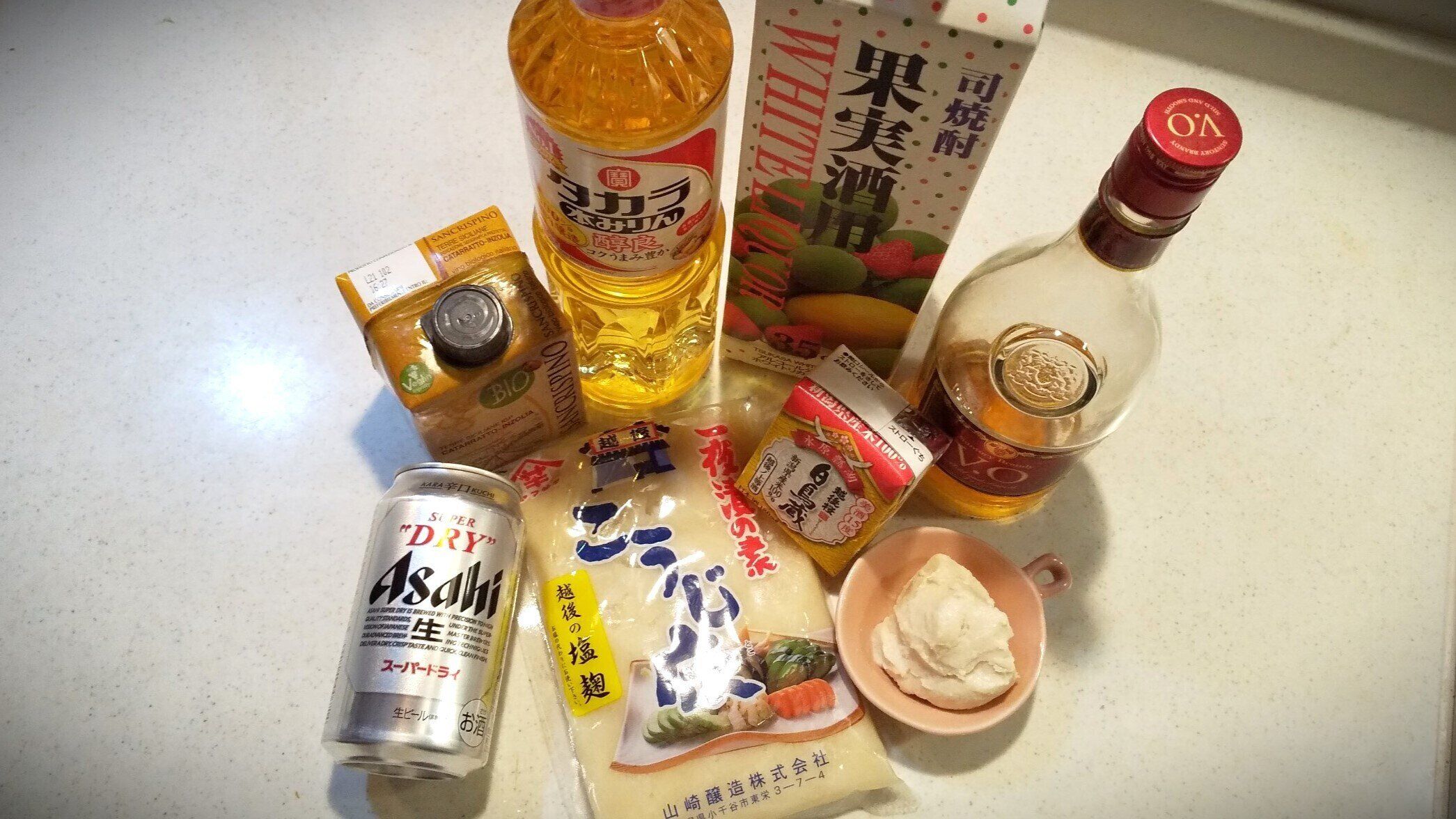 このことから、アルコールを含む酒を中心に、似たような成分を含む調味料を代用食材として使ってみることにしました。代用食材の候補はいくつもあるのですが、筆者の自宅にあったもので料理酒の代用となりそうな食材は、以下のとおりです。