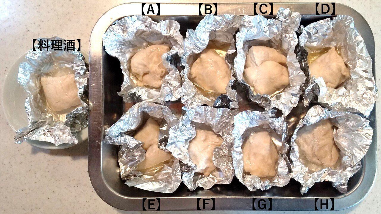 画像のいちばん左が「料理酒」、上段左から順に【A】【B】【C】【D】、下段左から順に【E】【F】【G】【H】を使用して蒸したささみを並べてみました。