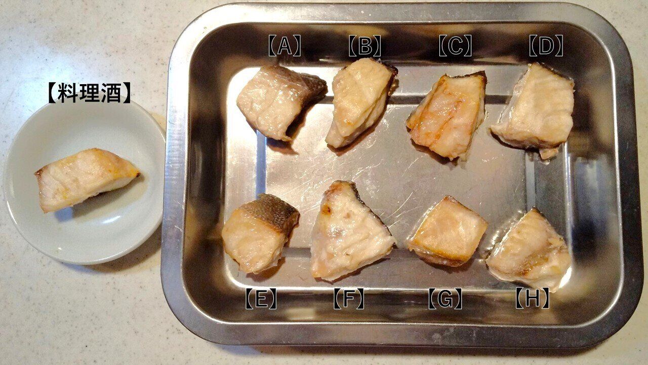 画像のいちばん左が「料理酒」、上段左から順に【A】【B】【C】【D】、下段左から順に【E】【F】【G】【H】を使用して焼いた白身魚を並べてみました。