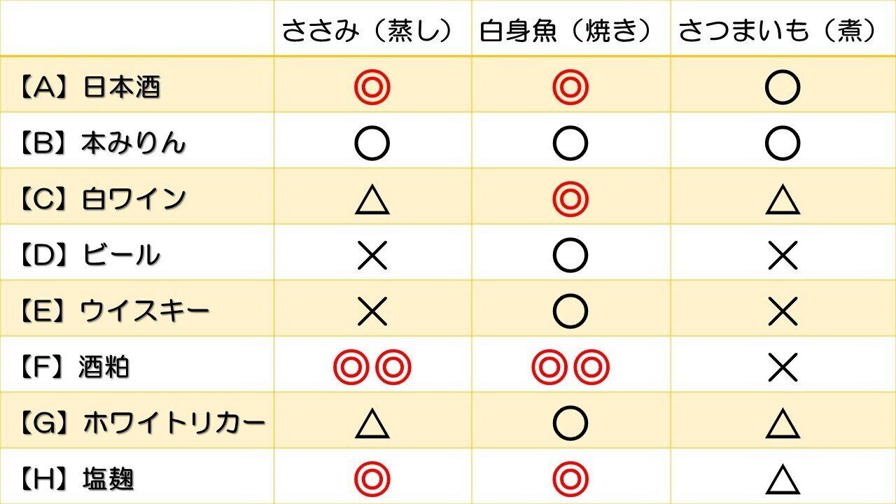 3つの検証結果をまとめると上の表のようになります。代用料理酒は、料理や食材ごとに合うものが異なることがわかります。