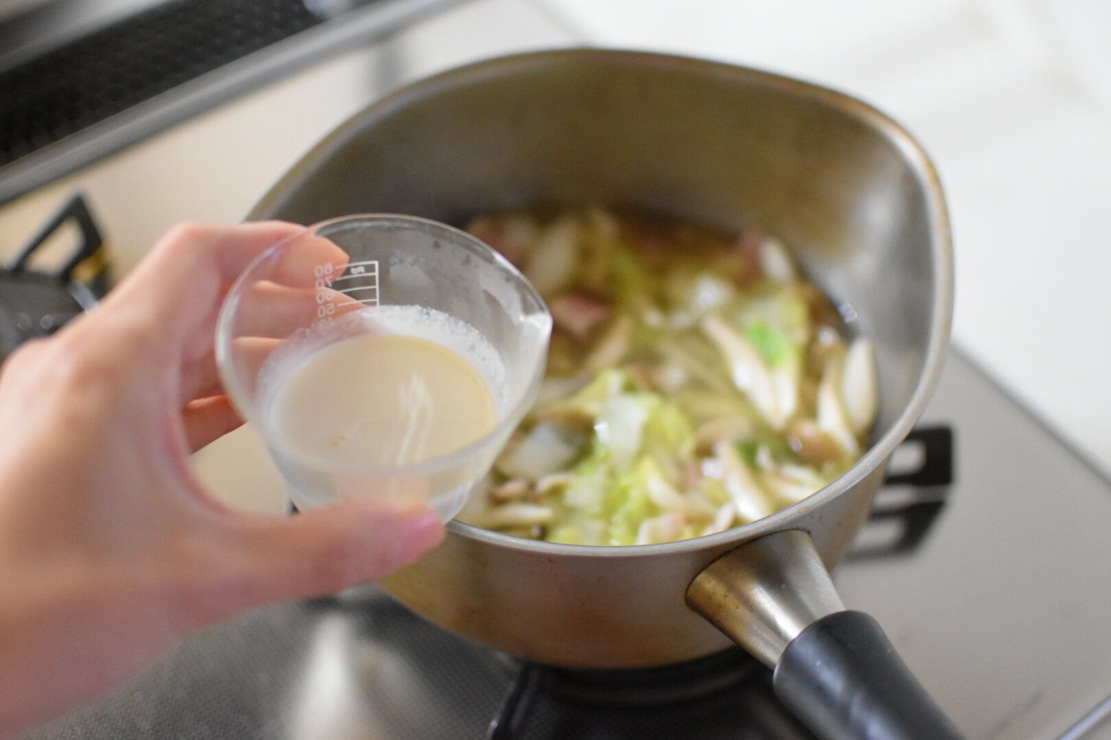 2.白菜がしんなりしたら、火を止めて豆乳を加えて再び加熱する
