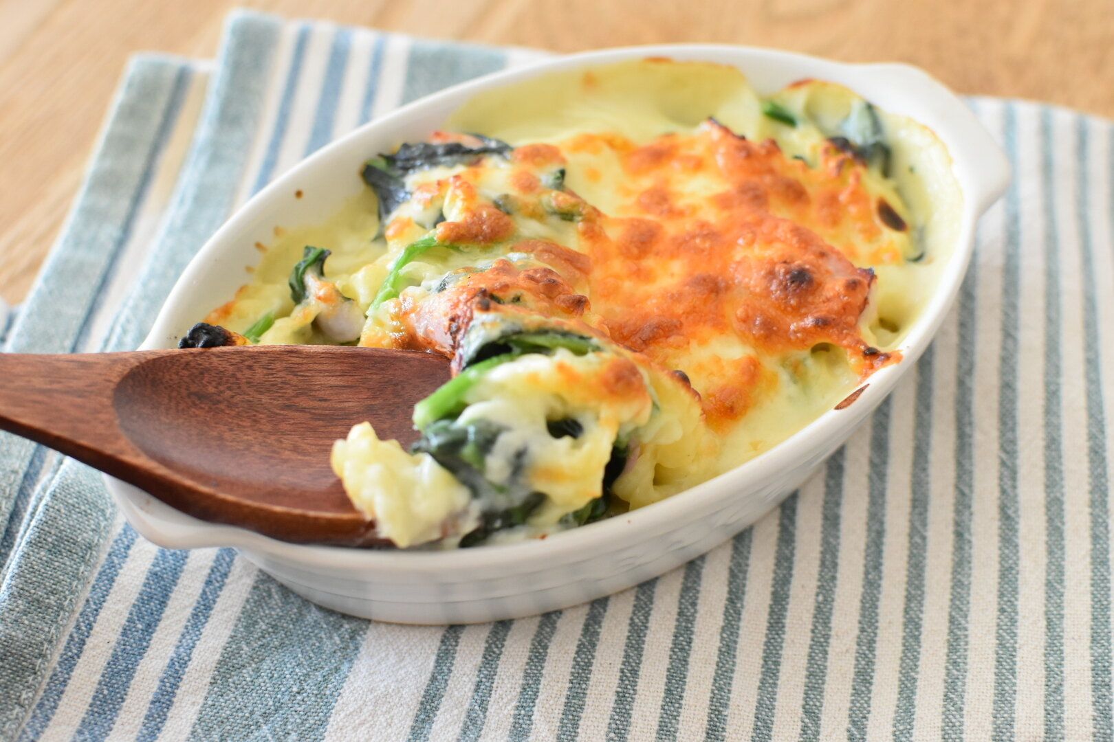 豆乳スープに小麦粉や米粉でとろみをつけるとシチューにもアレンジできます。そしてチーズをかけて焼けばグラタンに!