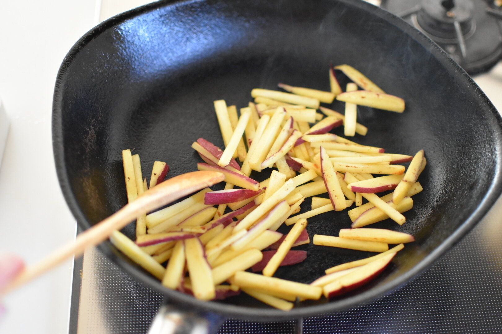 2.フライパンに分量外のサラダ油(大さじ1)をなじませ、中火でさつまいもを広げるように炒める