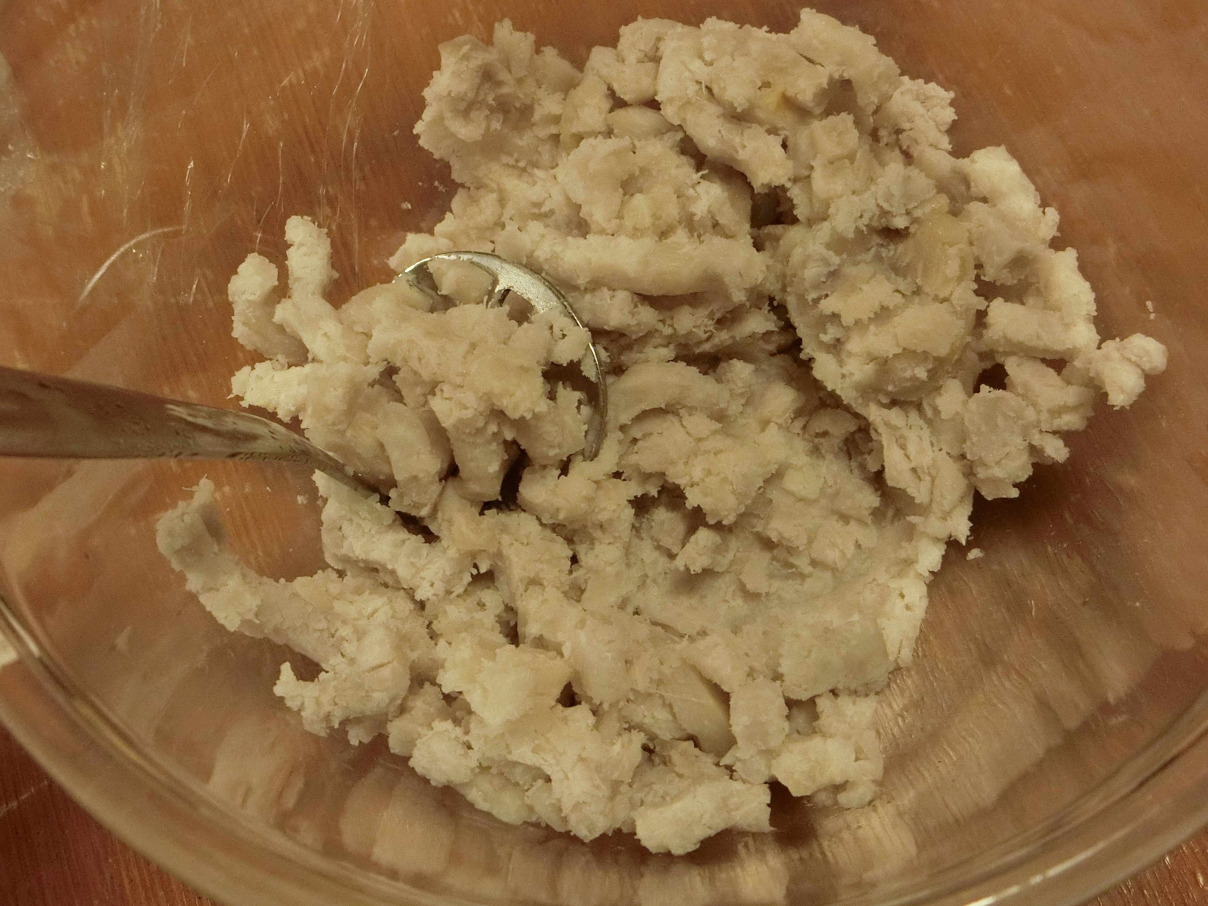 1.里芋は皮をむいて小さく切ります。耐熱容器に入れて電子レンジ600Wで5分加熱し、熱いうちにつぶします。