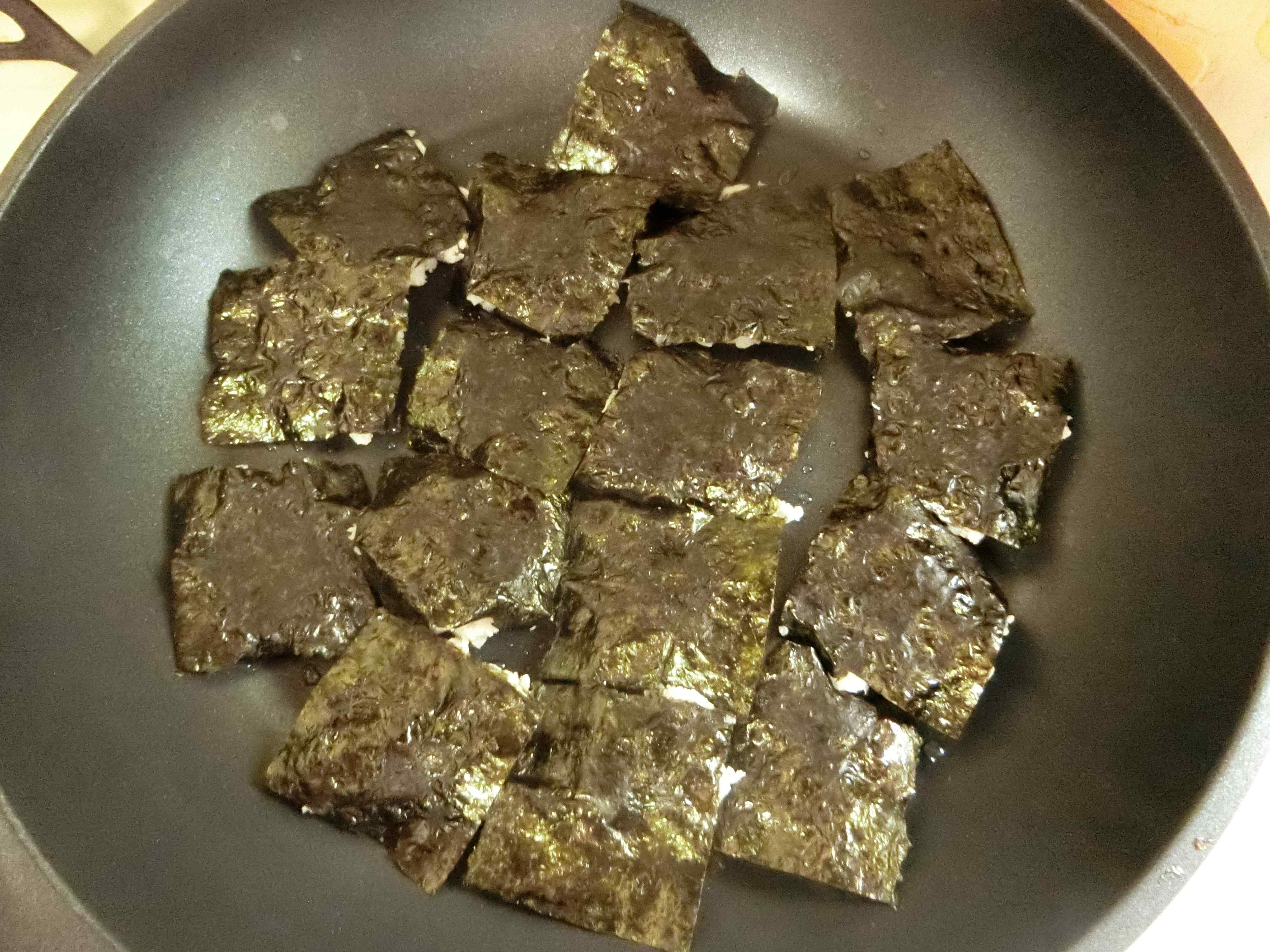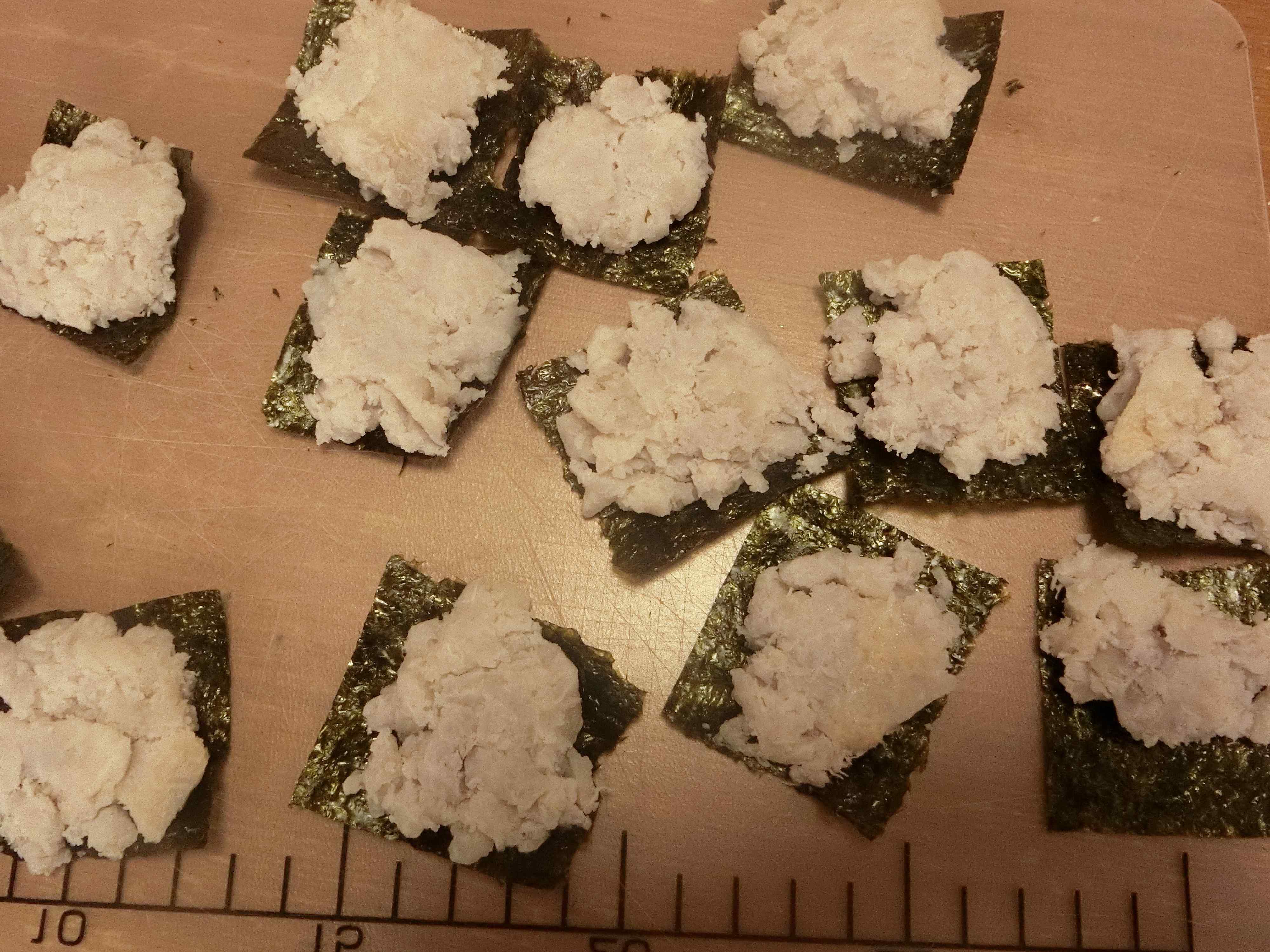 2.海苔を16等分にし、1をスプーンで海苔に塗るように載せます。