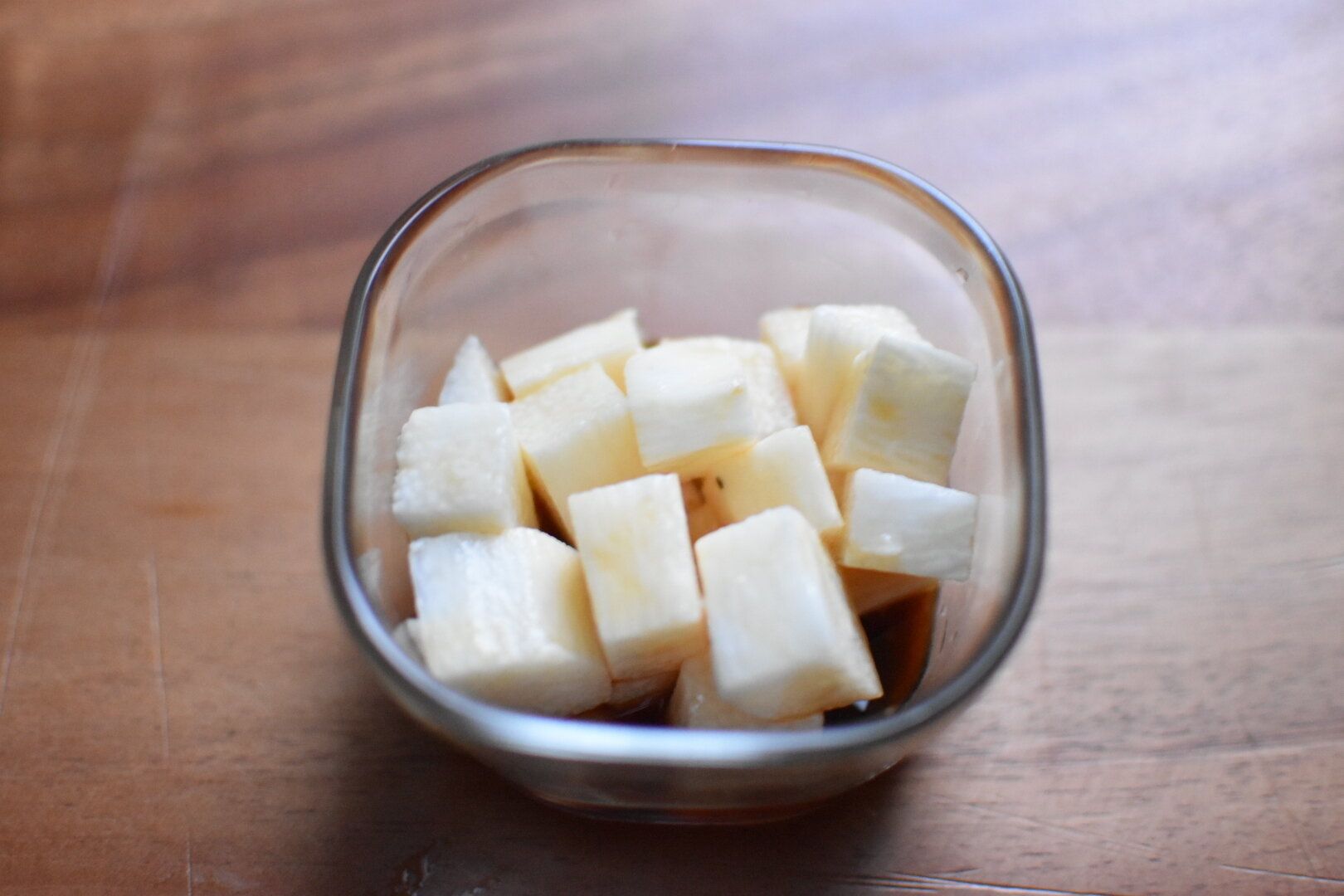 皮をむいて食べやすいサイズにカットした長芋をめんつゆとお酢に漬ける