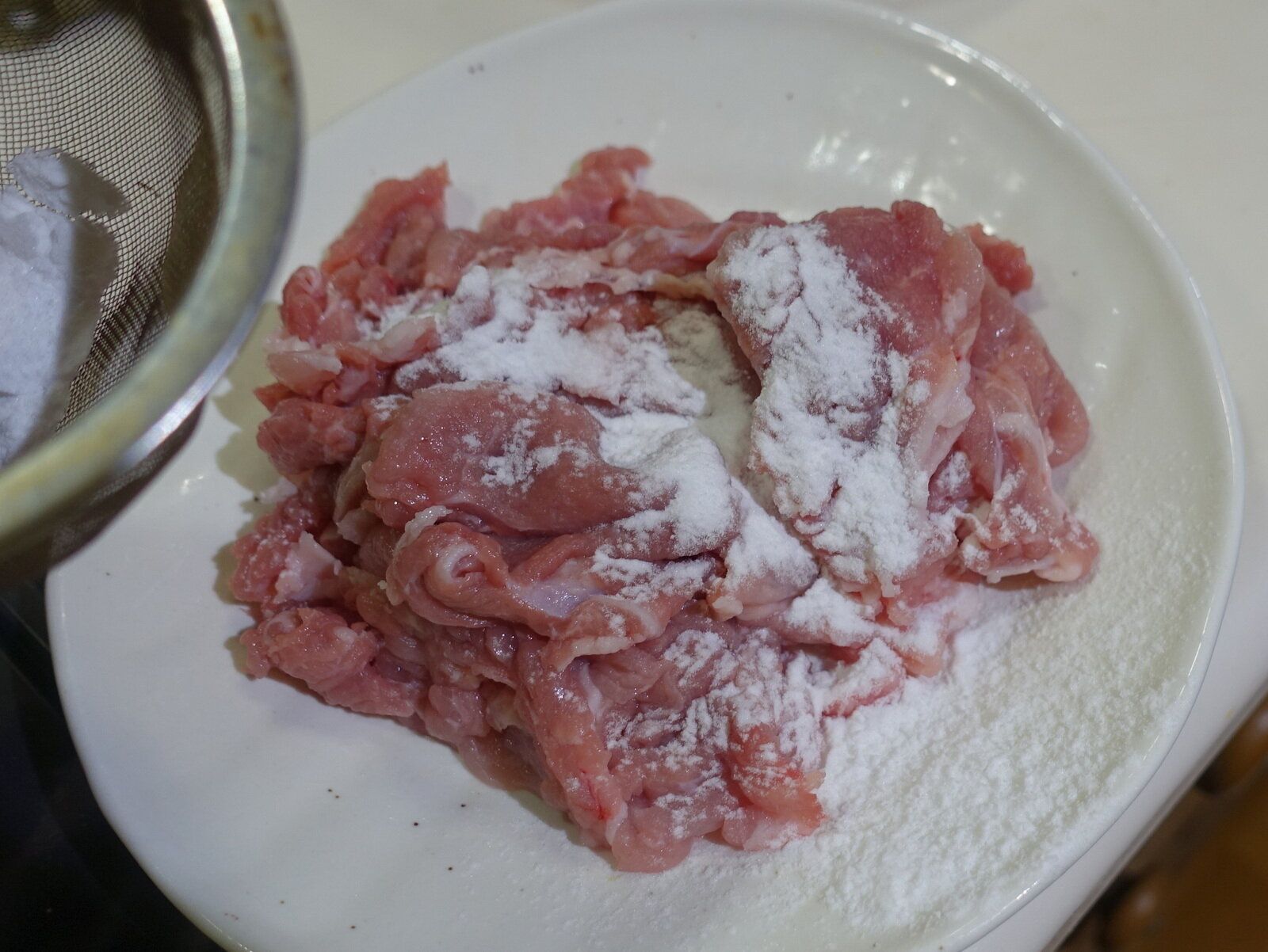 茶こしなどで片栗粉を肉にまんべんなくかけていきます。茶こしを使わなくてもふりかけてもみこんでも大丈夫です。また、お皿の上で片栗粉をまぶさなくてもフライパンに入れてからでも大丈夫です。