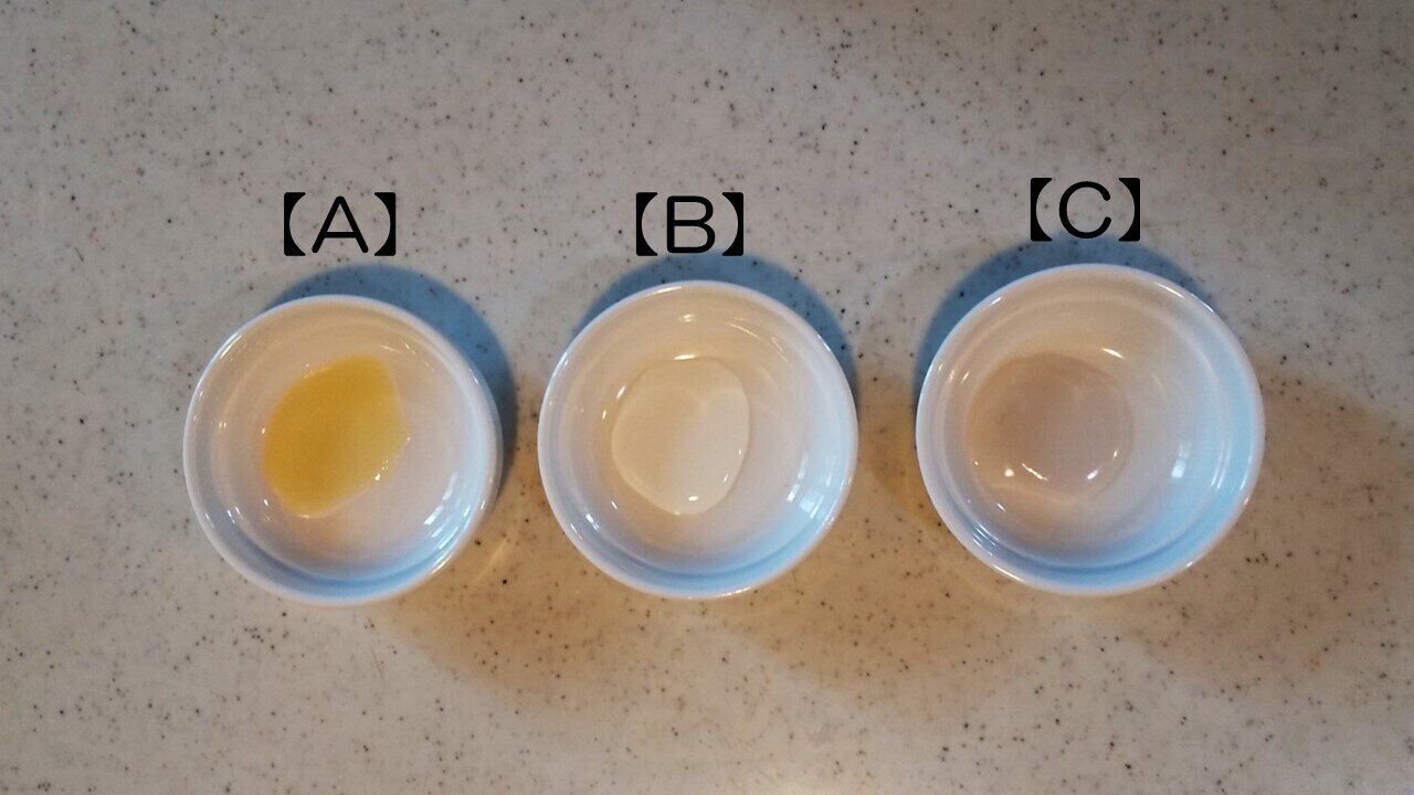 これらの見た目を比較すると、【A】は淡い黄色、【B】は白色、【C】は淡い灰色となっていました。