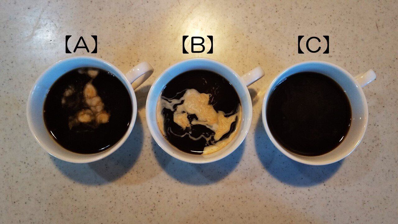 【A】は一部沈んだようなまだら状に、【B】は生クリームのような筋を伴った状態に、【C】はコーヒーと一体化したのか(もしくは沈んだのか)全く見えない状態になりました。