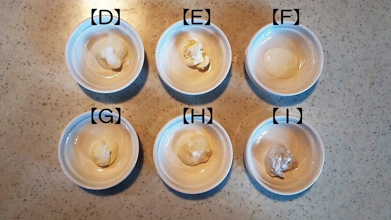 今度は、泡立てた場合の代用生クリームを並べてみました。画像の上段左から【D】【E】【F】、下段左から【G】【H】【I】となっています。