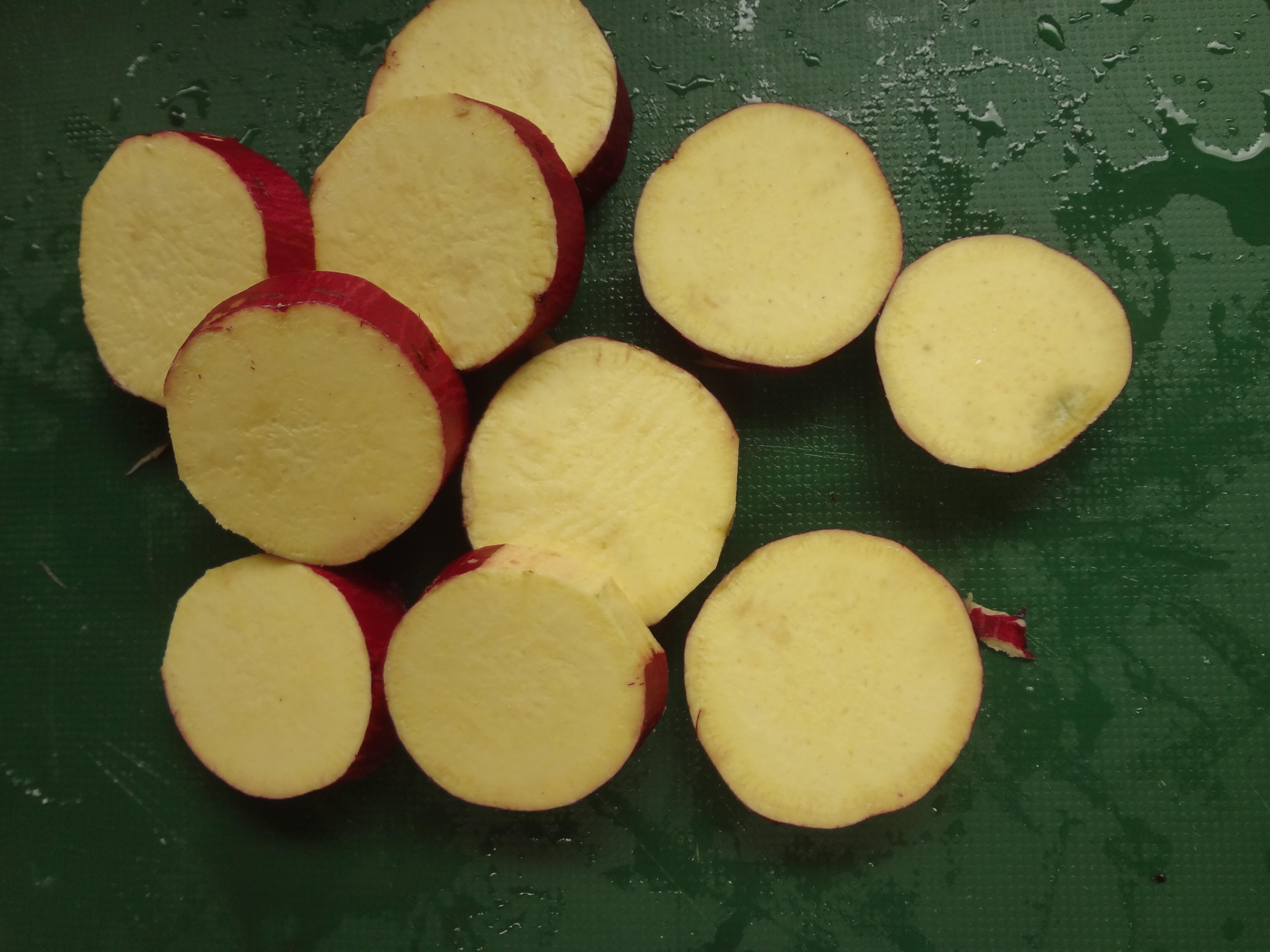 1.さつま芋は皮をよく洗って、皮つきのまま輪切りにして、水につけます。