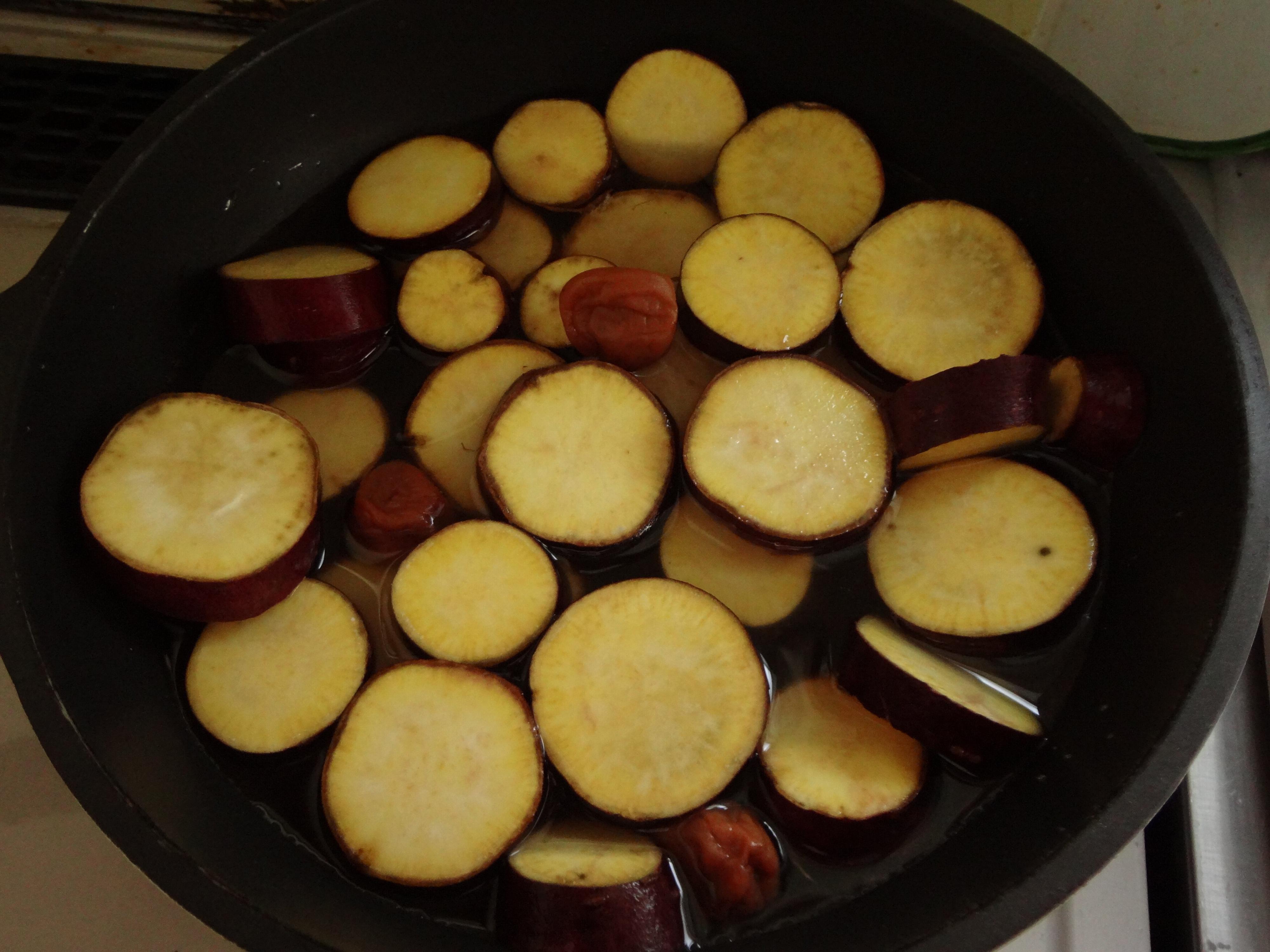 梅干しの数は大きさによって調節して下さい。梅干しははちみつ梅やかつお梅など、種類によって風味が変わります。水の分量は鍋によって調節し、さつま芋が浸るくらいにすると均一に火が通ります。