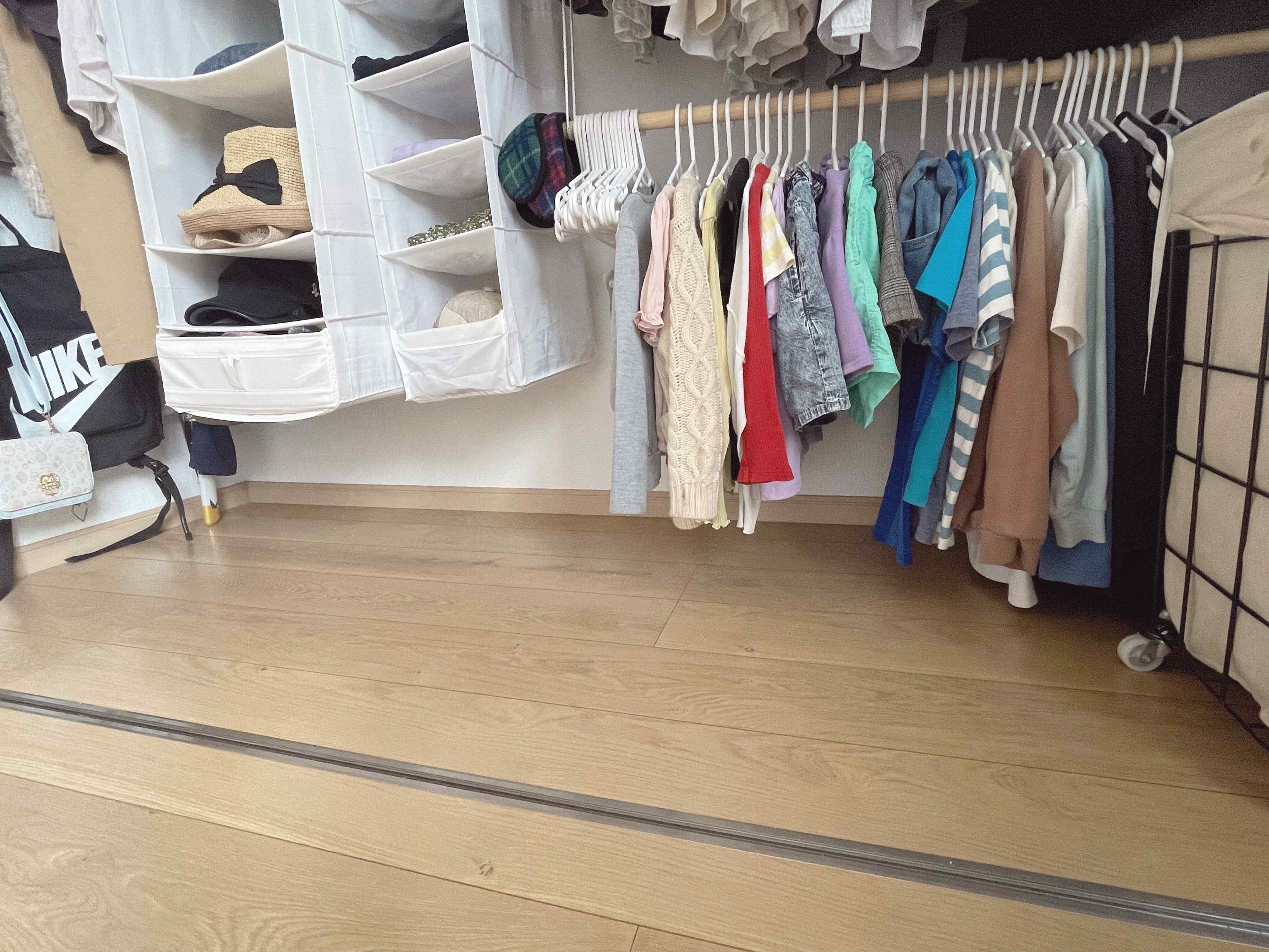 子ども服収納は、たたむ収納よりもハンガー掛け収納がオススメです。子どもの届く位置になるよう、ヒモで調整してブランコ式のハンガーをつくります。輪っかのヒモをつくり、棒を吊るすだけなのでとてもカンタンです。