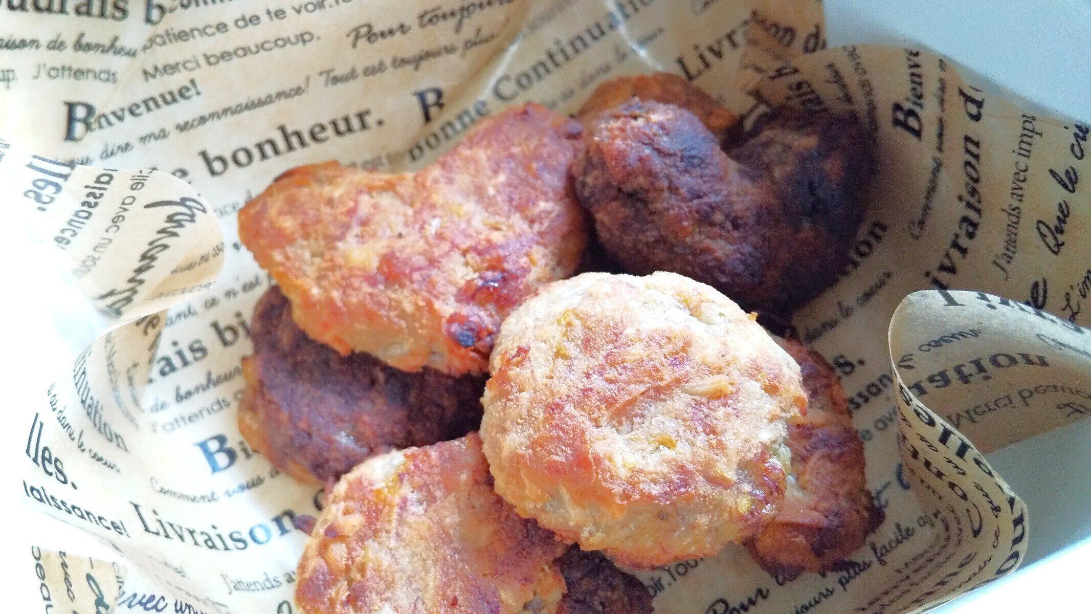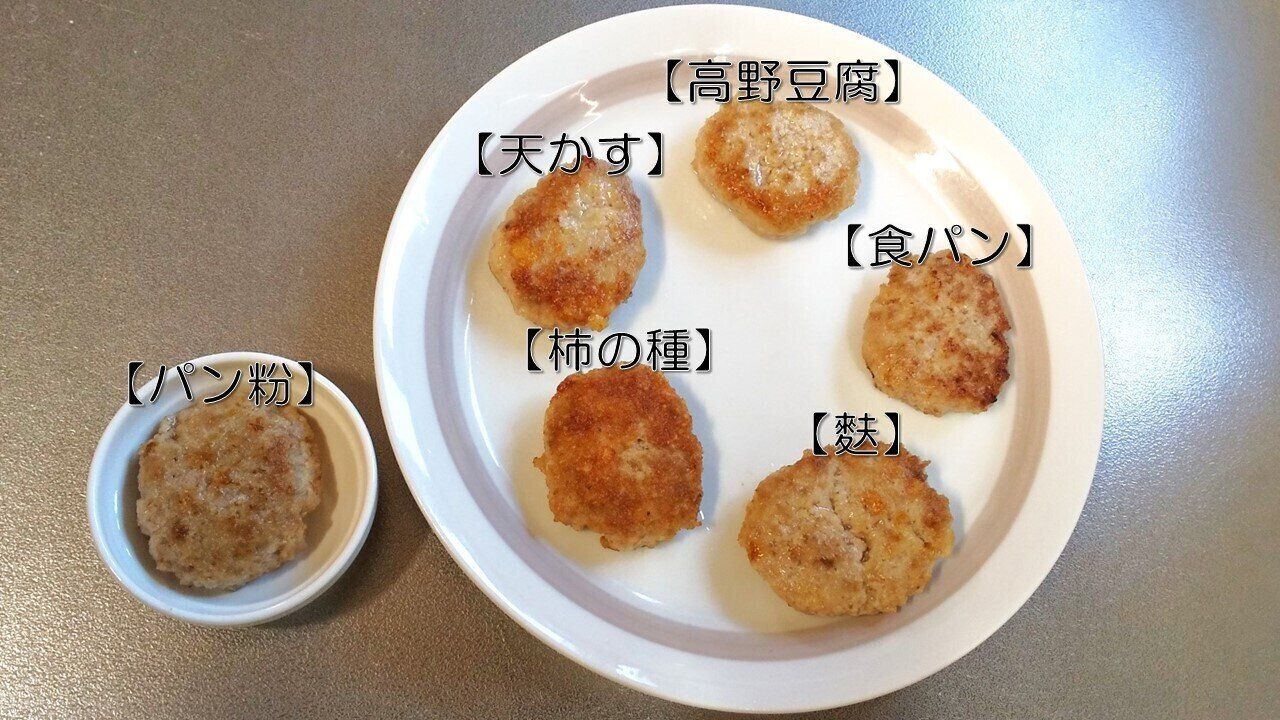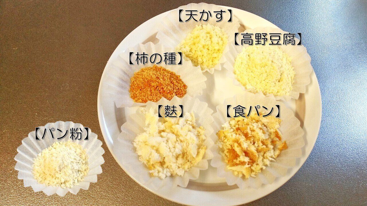パン粉を使用したものと比較したのが、写真の通りです。上段中央から時計回りに【高野豆腐】【食パン】【麩】【柿の種】【天かす】を使用したものを並べてみました。