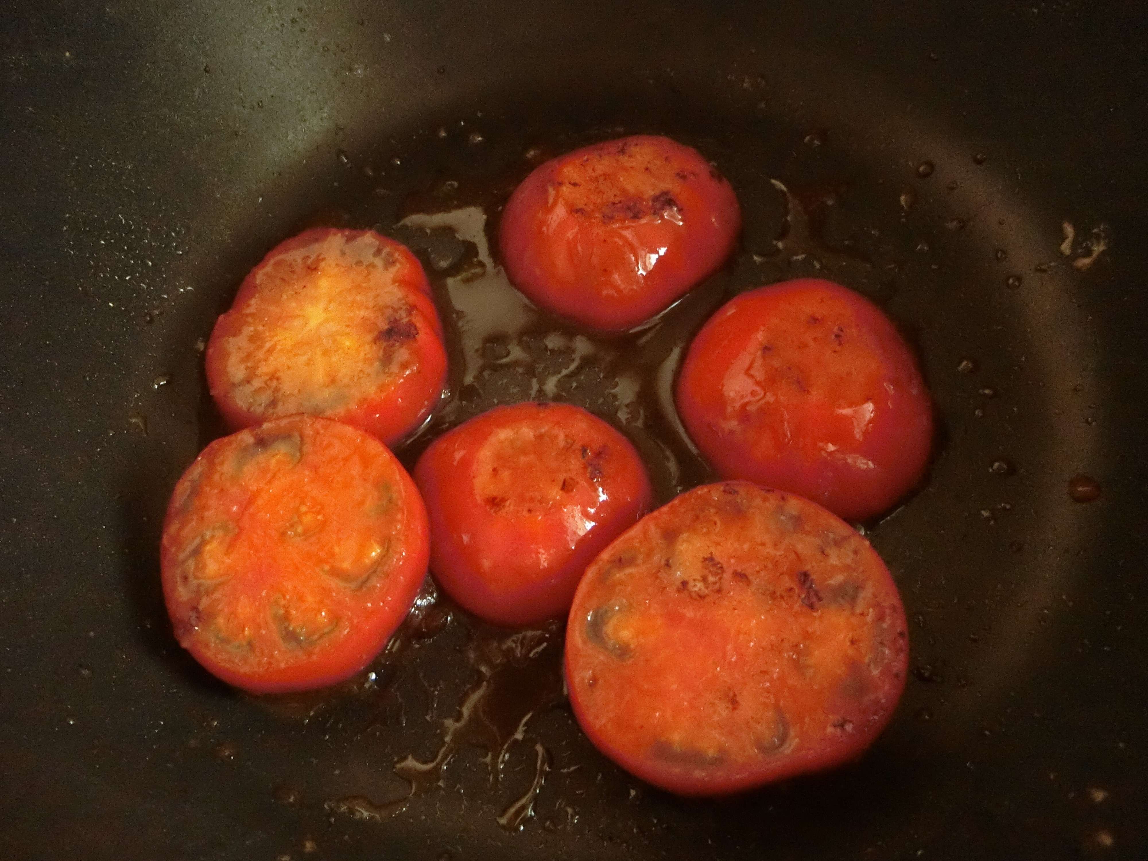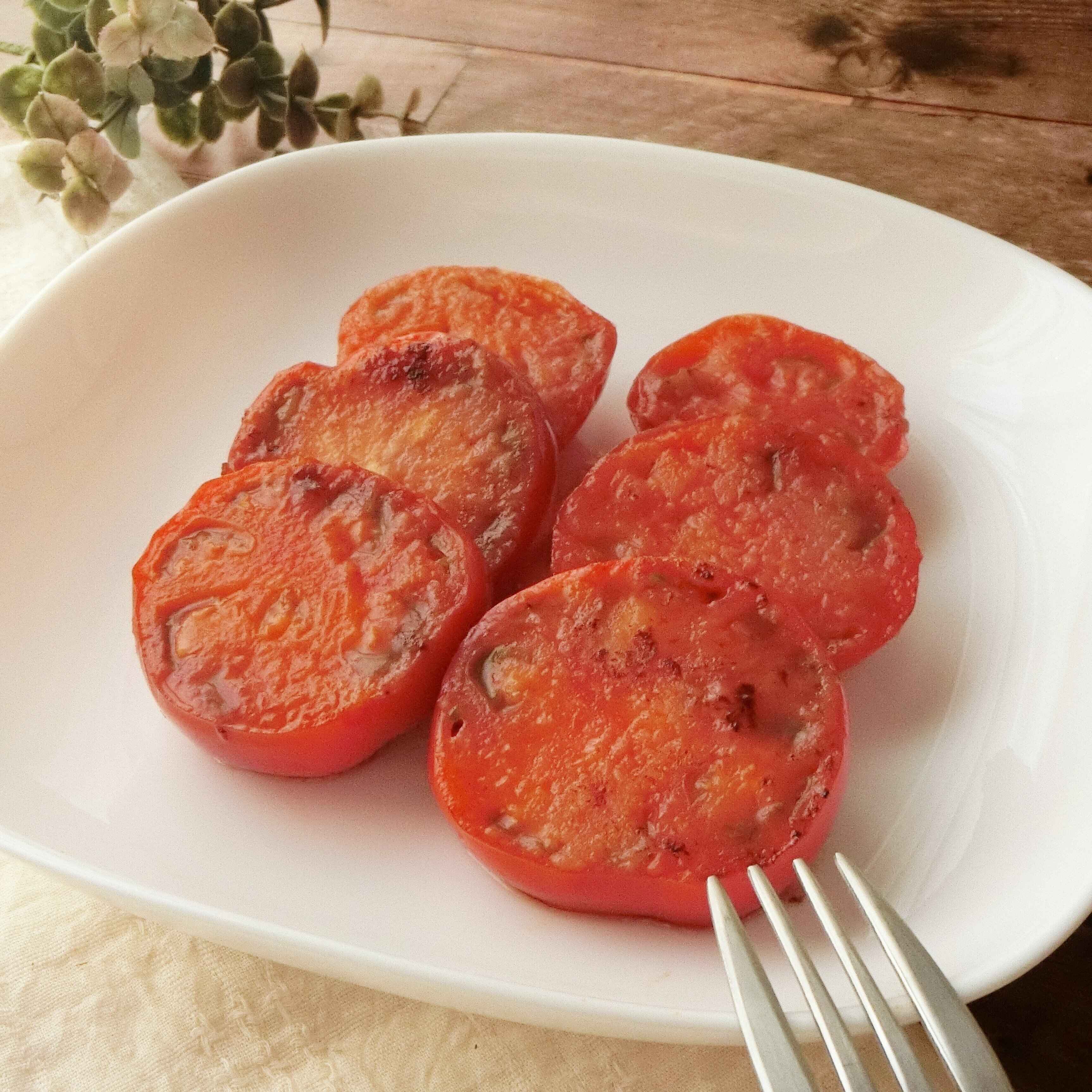 トマトの厚さが薄いと火が通り過ぎてしまうので、厚めに切ってさっと焼くといいです。薄力粉をふるとドレッシングがしっかりからまります。