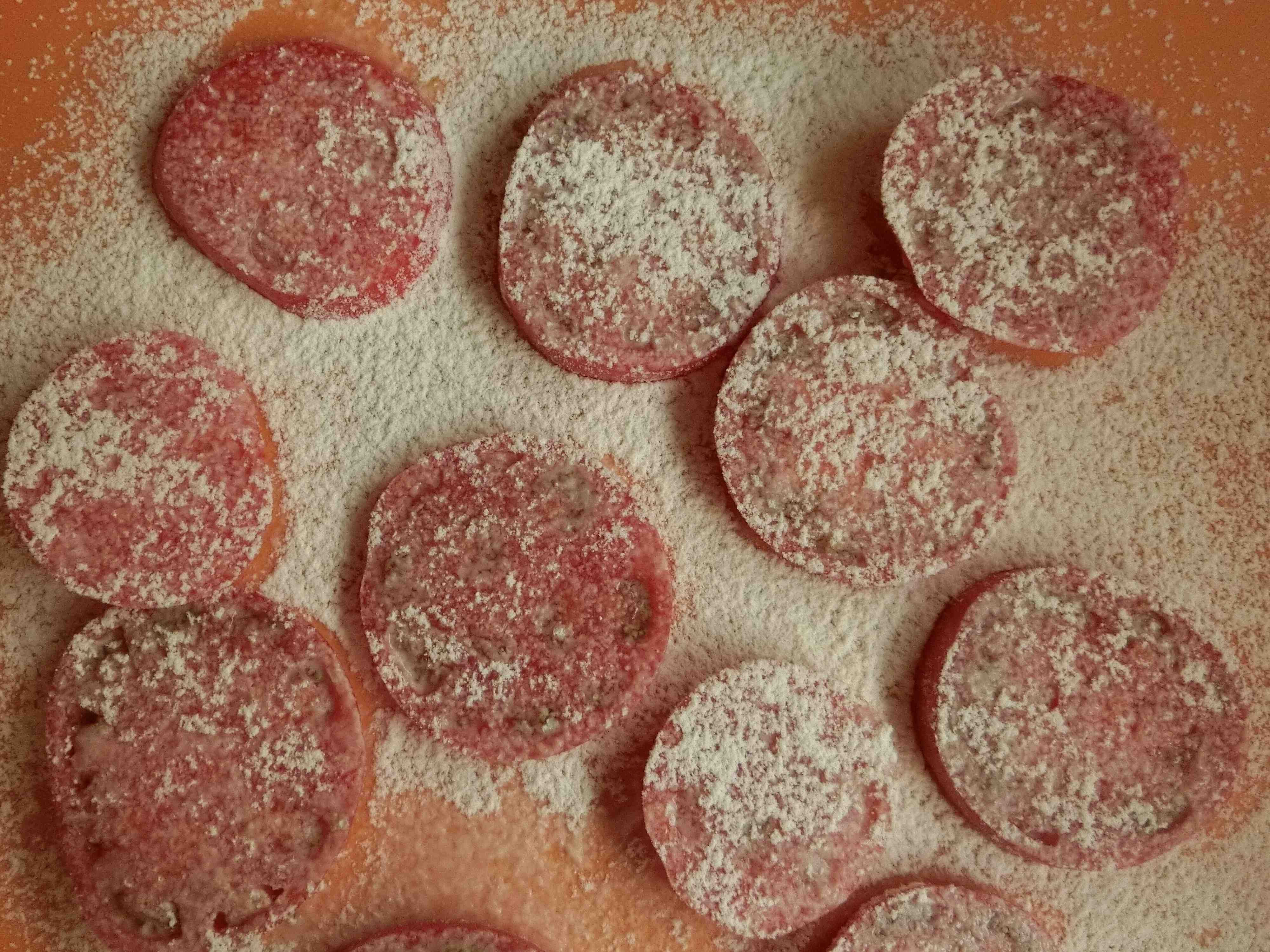 1.トマトは厚さ2cmくらいの輪切りにし、薄力粉を両面にふります。
