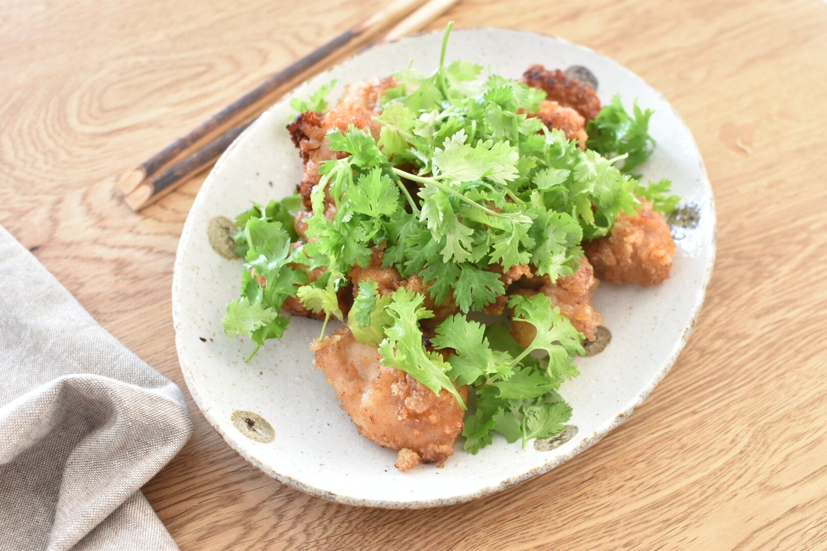 パクチーの柔らかい葉の部分を中心に、唐揚げにたっぷり乗せるだけ!