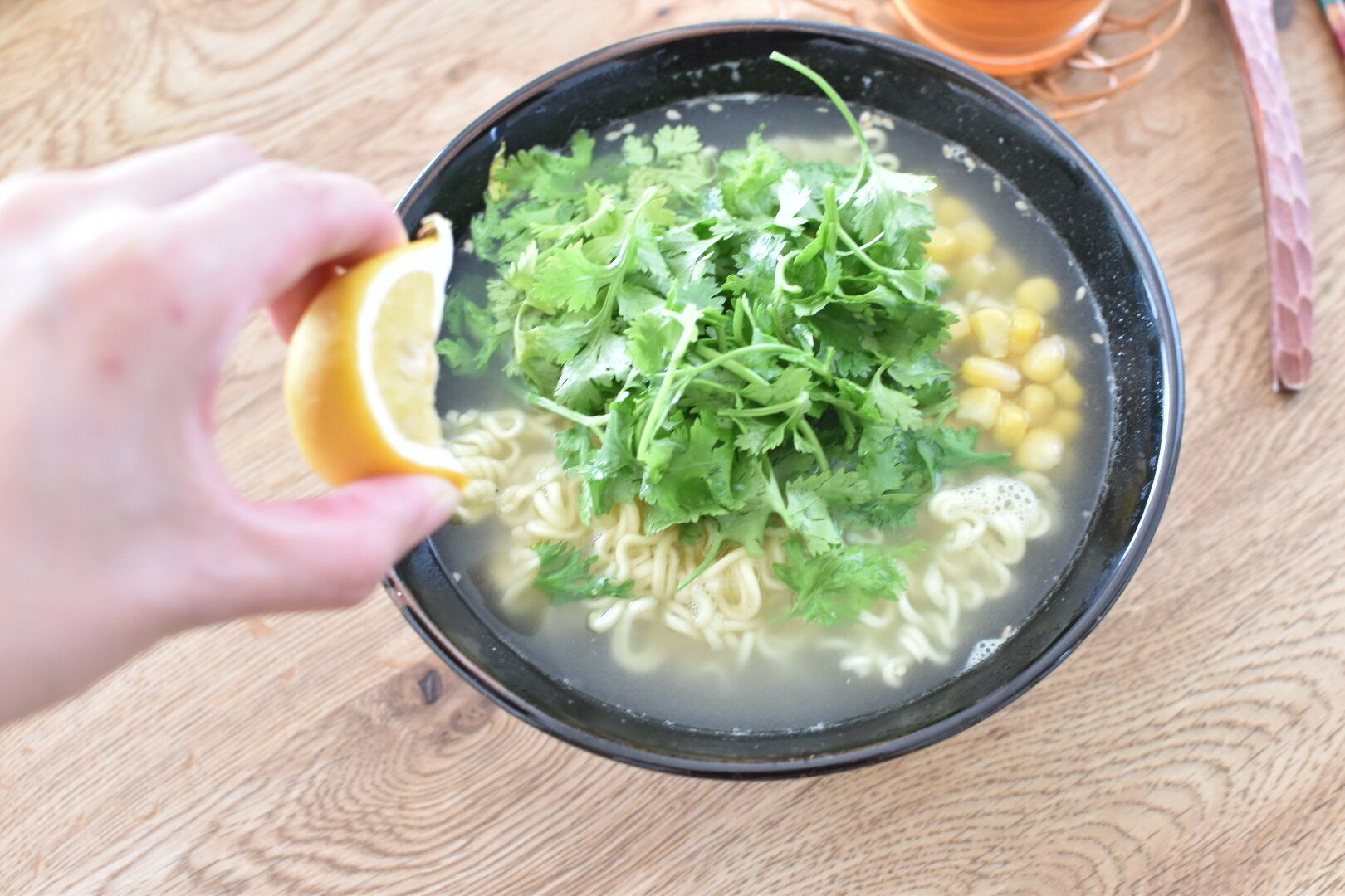 インスタントラーメンの罪悪感をたっぷりのパクチーでやわらげてくれますよ。