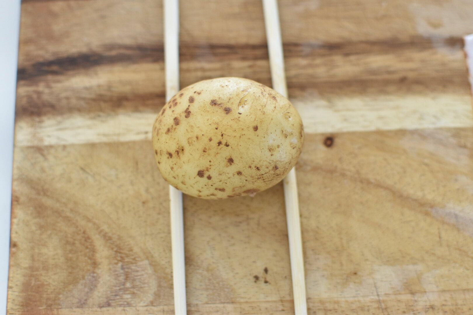 新じゃがいもはしっかり洗って土を落としたら、根元を落とさないように気をつけながら薄く切れ目をいれます。割りばしなどを添えておくと根元を残したままカットができて便利。