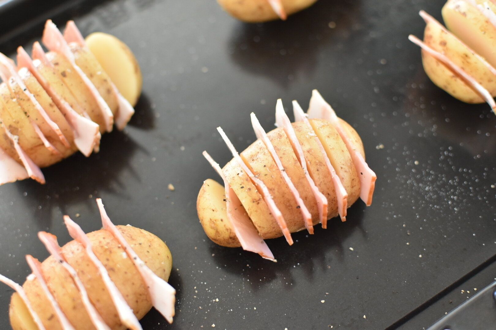 じゃがいものサイズに合わせてカットしたベーコンを切れ目の間にバランスよくはさんで焼き上げます。