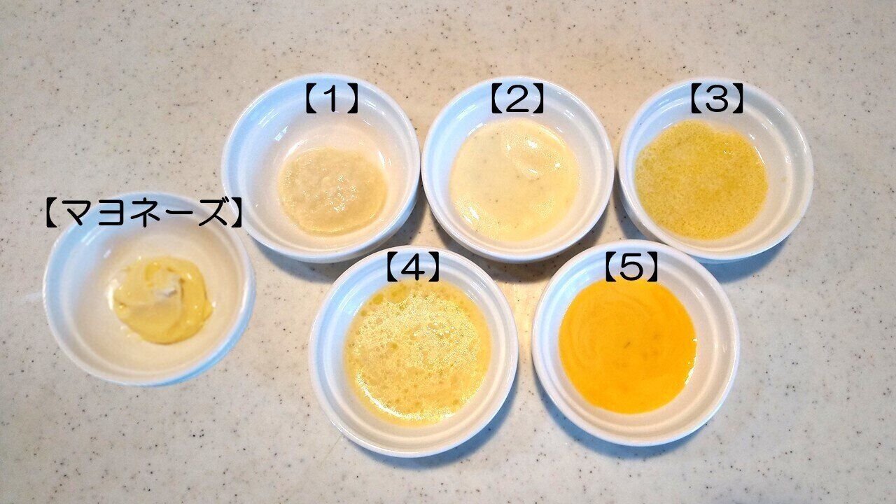 完成した代用マヨネーズを並べてみました。画像一番左が市販のマヨネーズ、上段その隣から順に【1】【2】【3】、下段左から【4】【5】となっています。