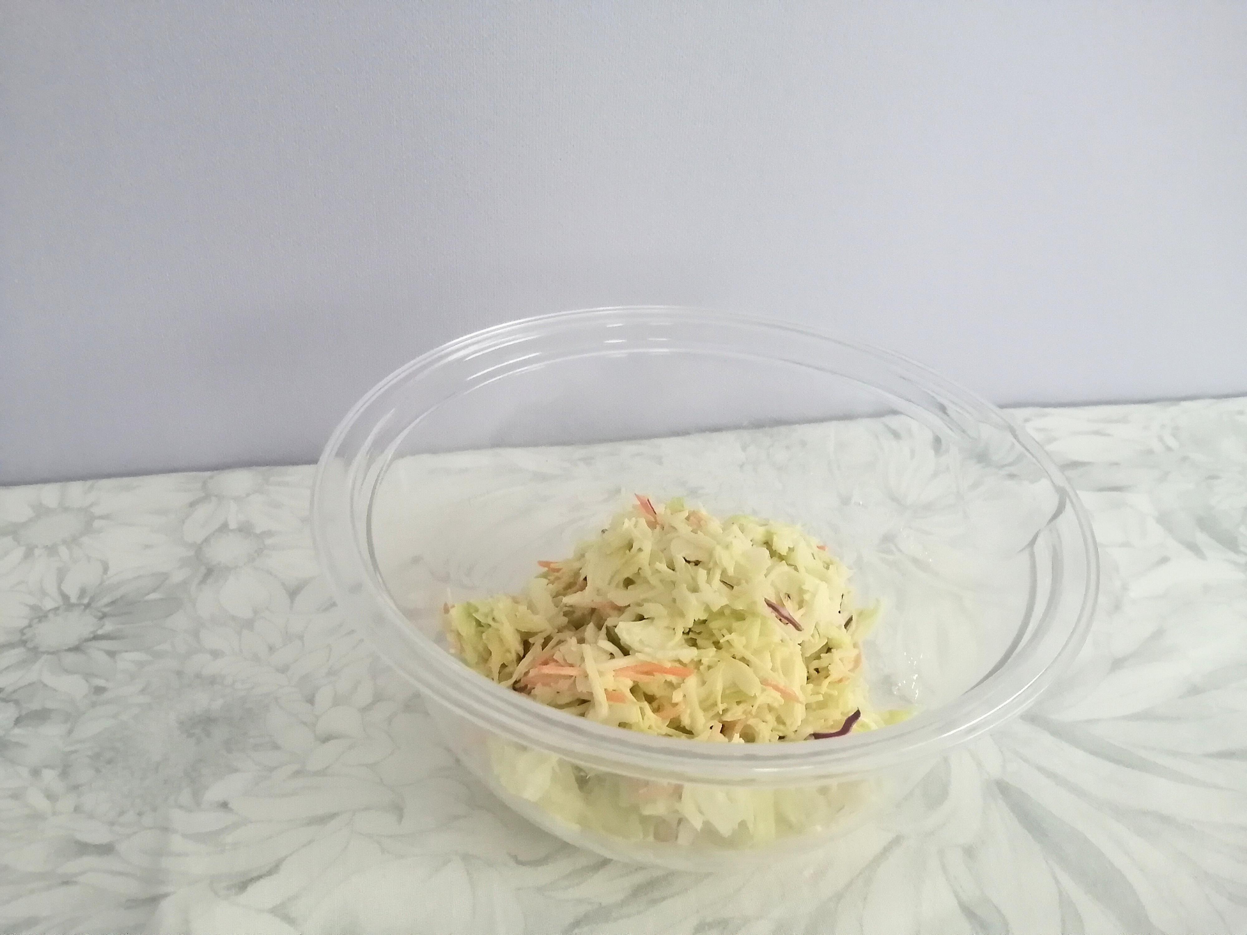 3,レンジにかけている間に器を準備しておき、コールスローを盛り付ける。