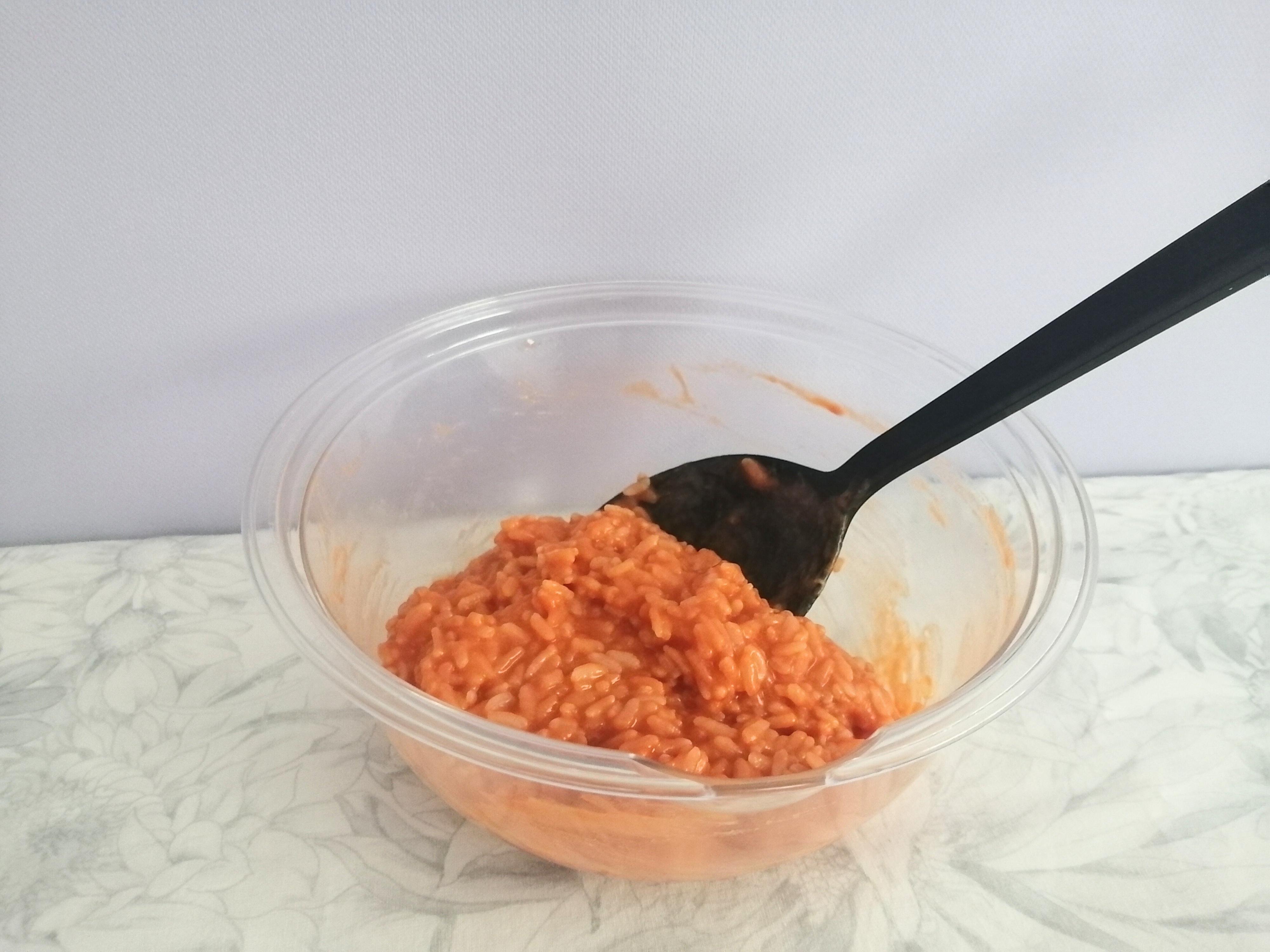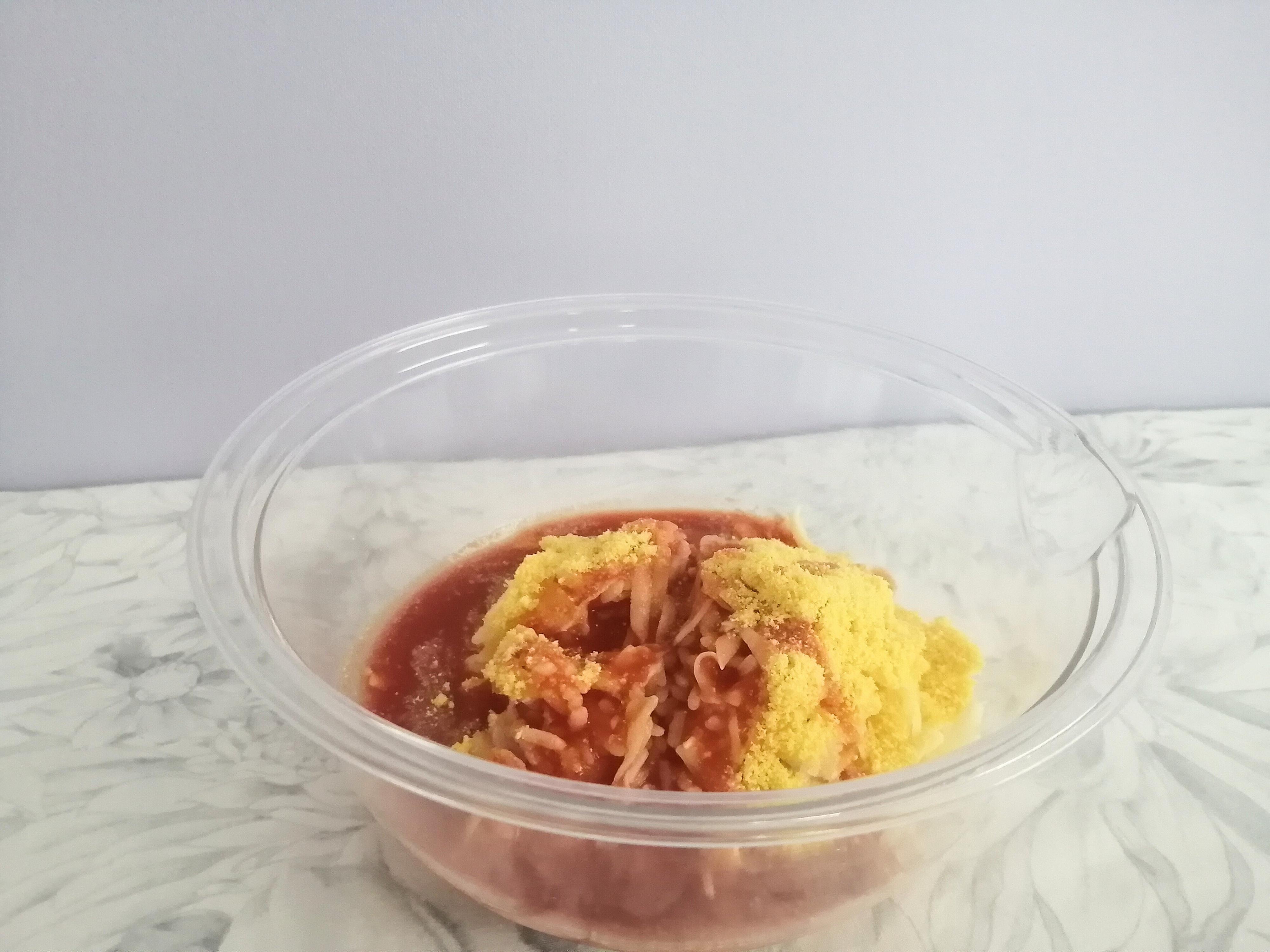 1,耐熱ボールに温かいご飯、溶けるチーズ、カップスープ、トマトジュースの順に入れる