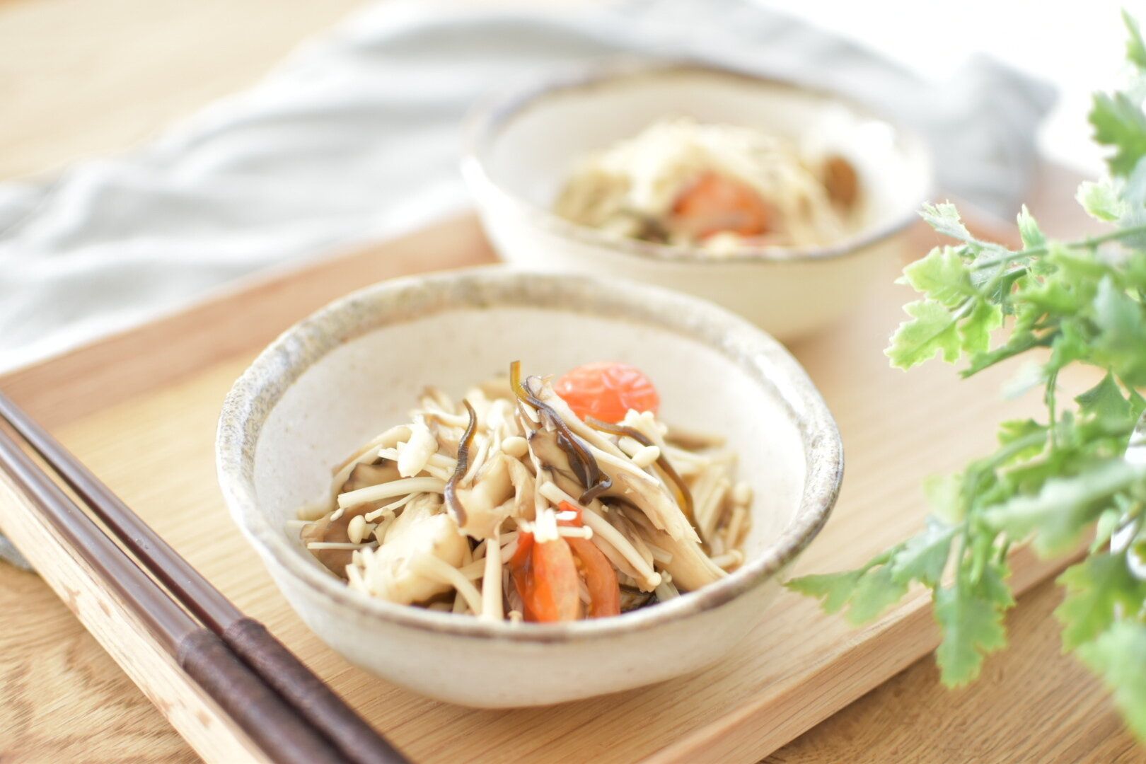 シャキシャキした食感のえのき茸とわかめをさっぱりいただけます。おなかの調子を整えてくれる食物繊維と、身体の余分な水分を出してくれるカリウムも豊富な副菜に。