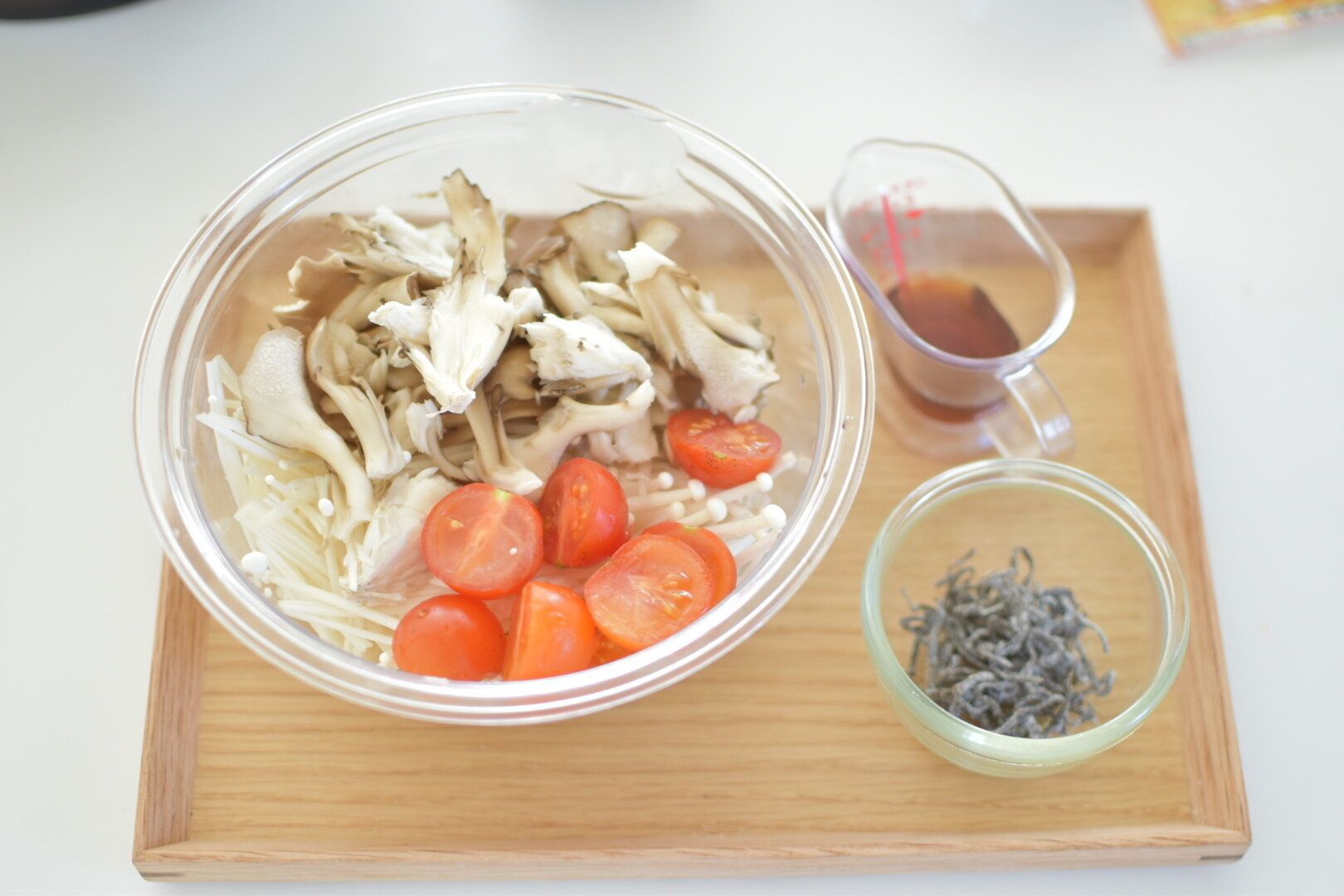 1.きのこ類は根元を落としてほぐし、トマトは食べやすいサイズにカットし耐熱容器にあわせる。塩昆布、めんつゆを回しかける。