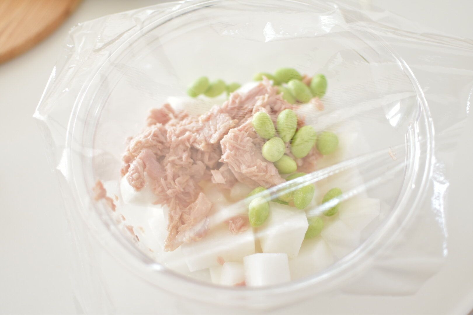 耐熱容器に大根、ツナ缶、コーンや枝豆をあわせたらめんつゆを回しかける。