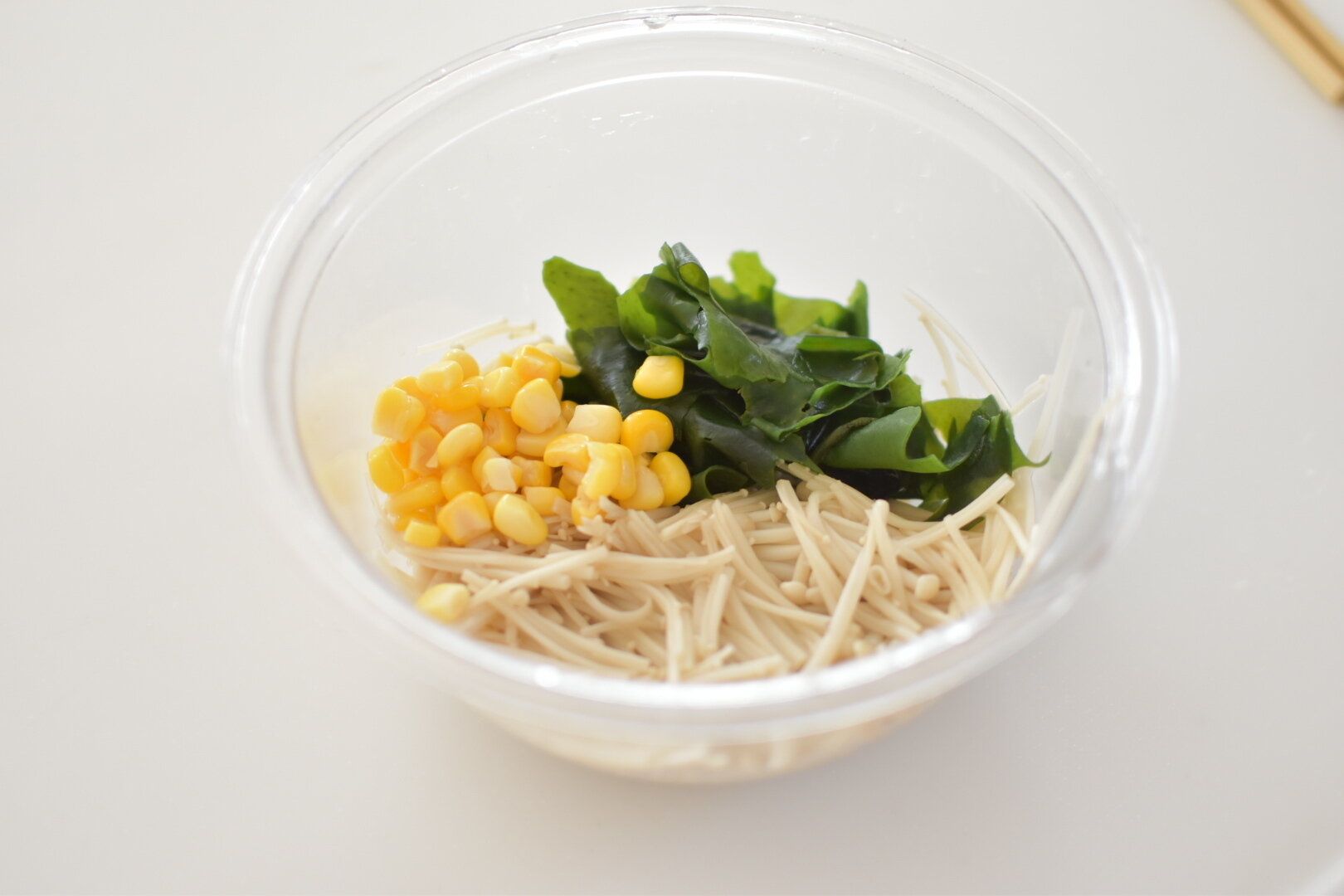 2.耐熱容器に食べやすくカットしたえのき茸、わかめ、コーンをあわせる。めんつゆを回しかけ、ふんわりとラップをして600Wで約2分加熱する。加熱が足りなければ20秒ほど追加する。