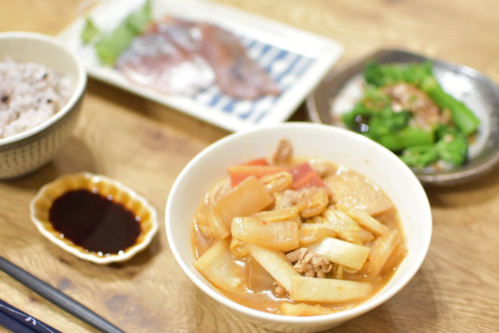 買い物前後の夕食は、冷蔵庫をすっきりさせるメニューが定番。少し残ったキムチを消費するためにスープをメインに。すぐに食べたいお買い得品を添えることも。近所のスーパーは夕方になるとお刺身が割引になるのでよく狙って購入しています。
