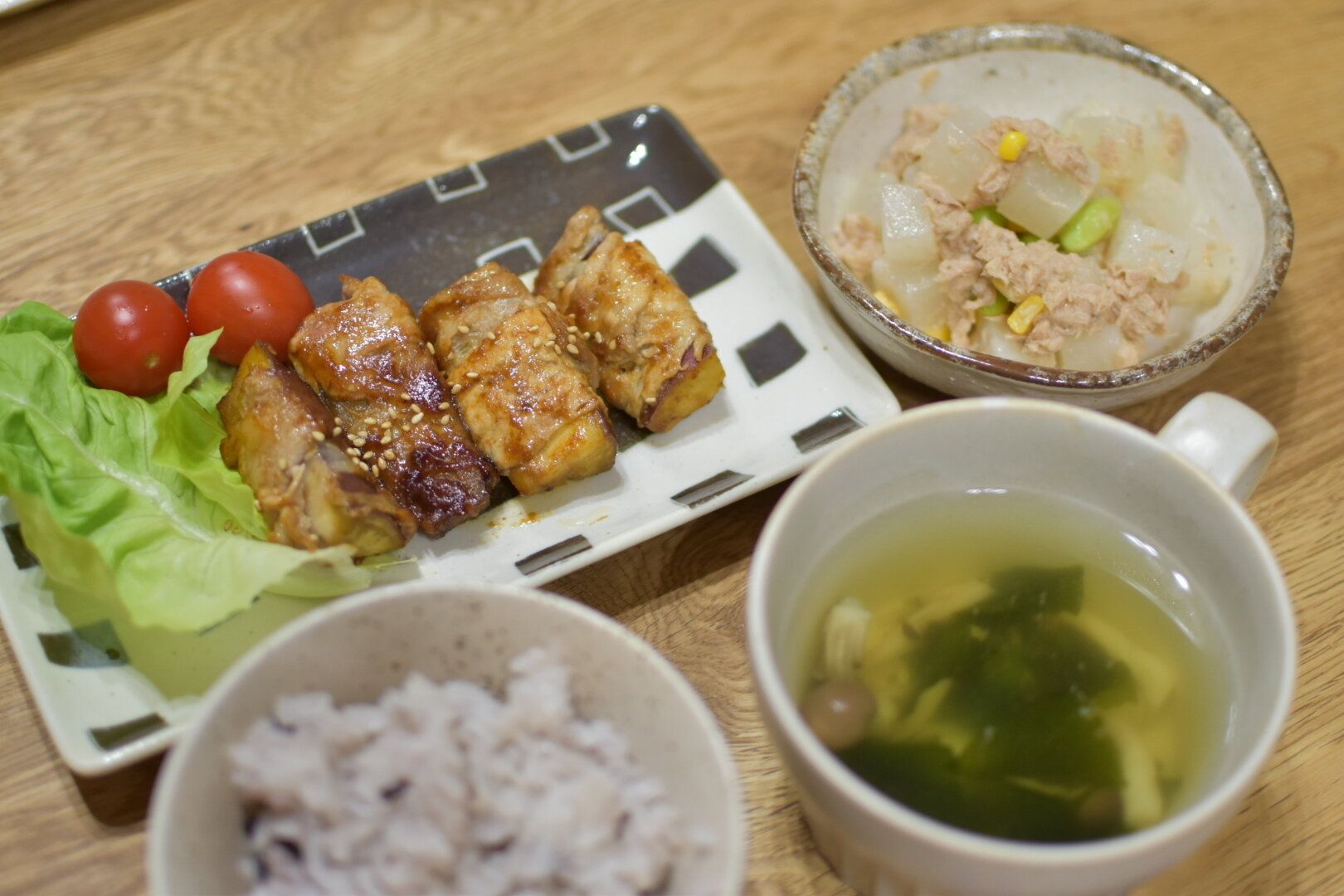 野菜をたっぷり食べたい日は、豚肉で巻くのがわが家の定番。子どもから人気のさつまいもを巻いて焼肉のたれで味付けをしています。エリンギ、人参、白ネギを巻くことも。