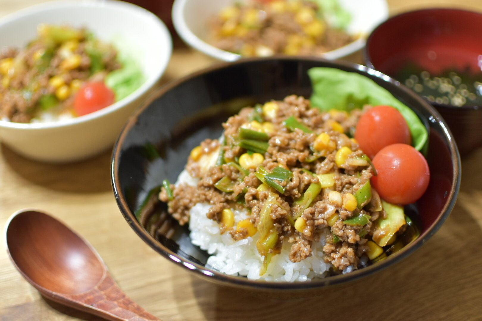 仕事が遅くなる日や子どもの習い事で帰りが遅くなる日は、さっとつくれてさっと食べられる丼ものが助かります。使いやすい合いびき肉な常備しておくと困りません。