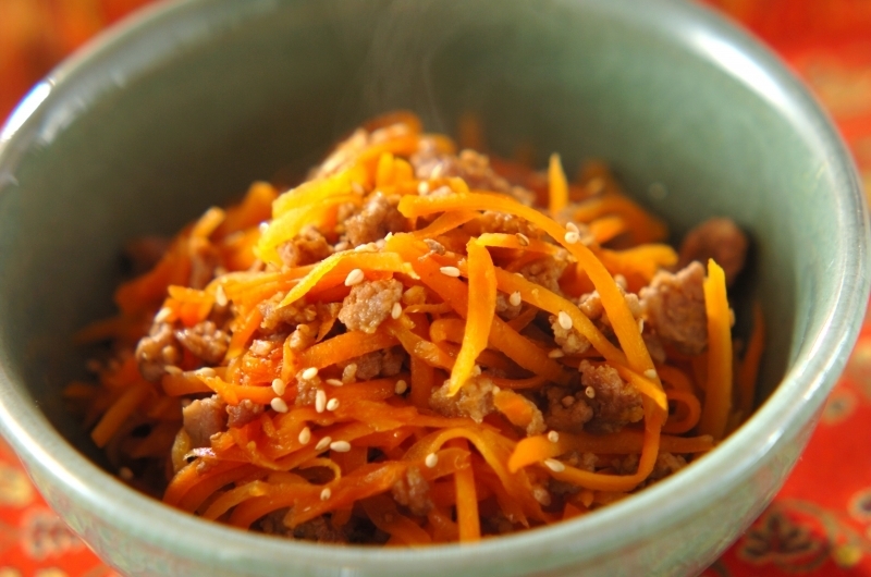 材料に豚ひき肉を加えることで、食べ応えがあり、メインのおかずにもなるにんじんしりしりができあがります。