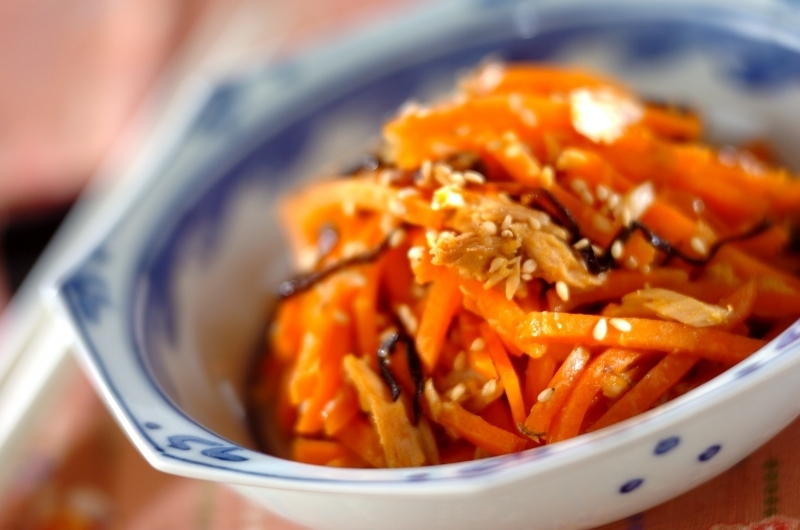 にんじんしりしりに塩昆布とツナを加えると、だしの効いた風味に仕上がり、にんじんをおいしく摂取することができます。