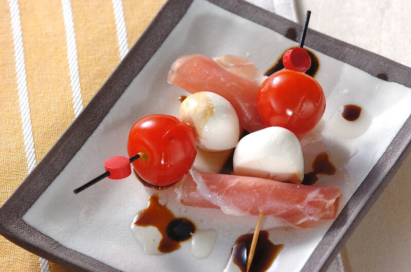 モッツァレラチーズを使っておつまみをつくりたい場合は、「トマト&チーズ串」がおすすめです。食材を串に刺した食べやすい一品で、生ハムの塩気、トマトの酸味、モッツァレラチーズのほどよいミルク感が絶妙にマッチします。とても簡単につくれるため、すぐに一品用意したいときにもおすすめです。